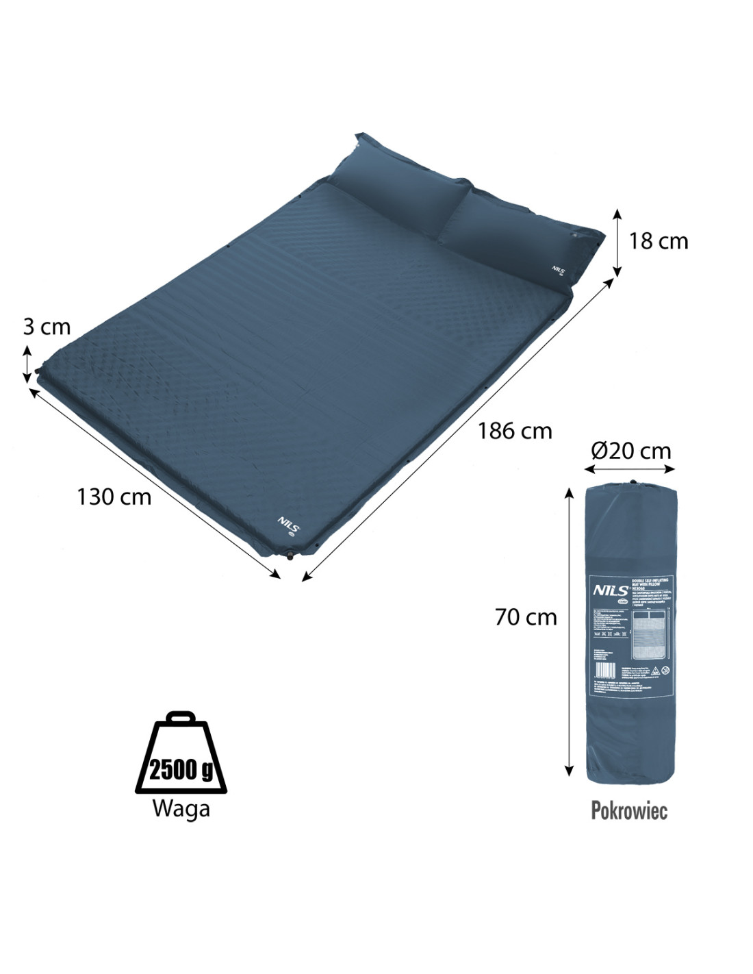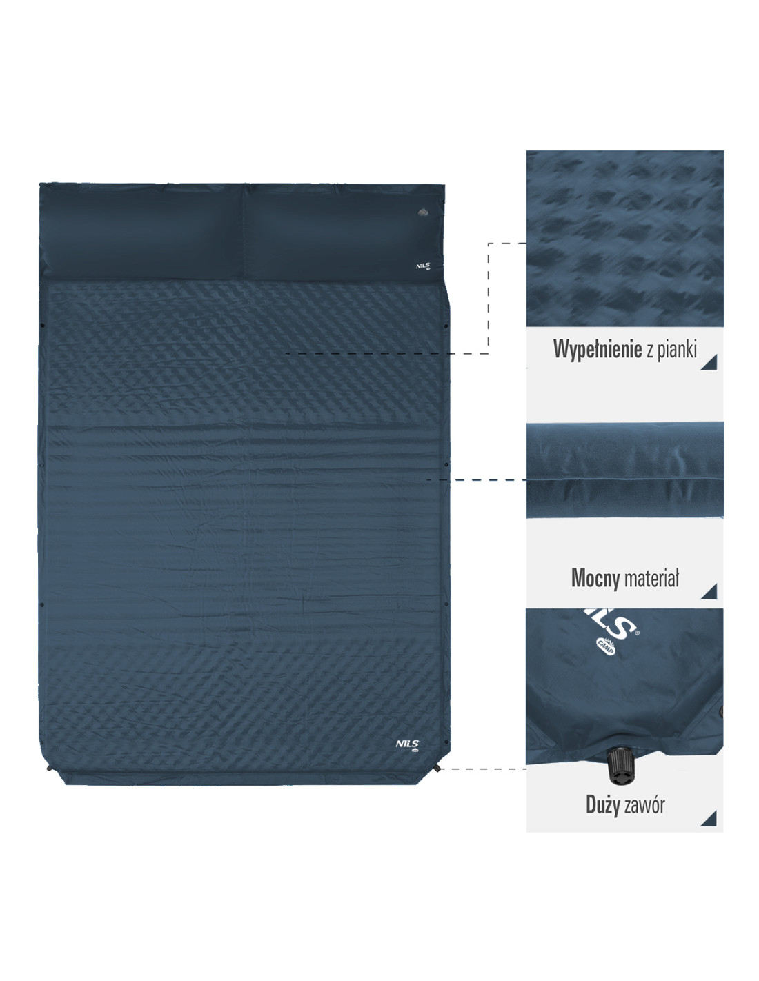 Самонадуващата се постелка с възглавница NC4060 е широка постелка за двама души, което е отлично решение за тези, които обичат да прекарват времето си на къмпинг, с палатка или на плажа.