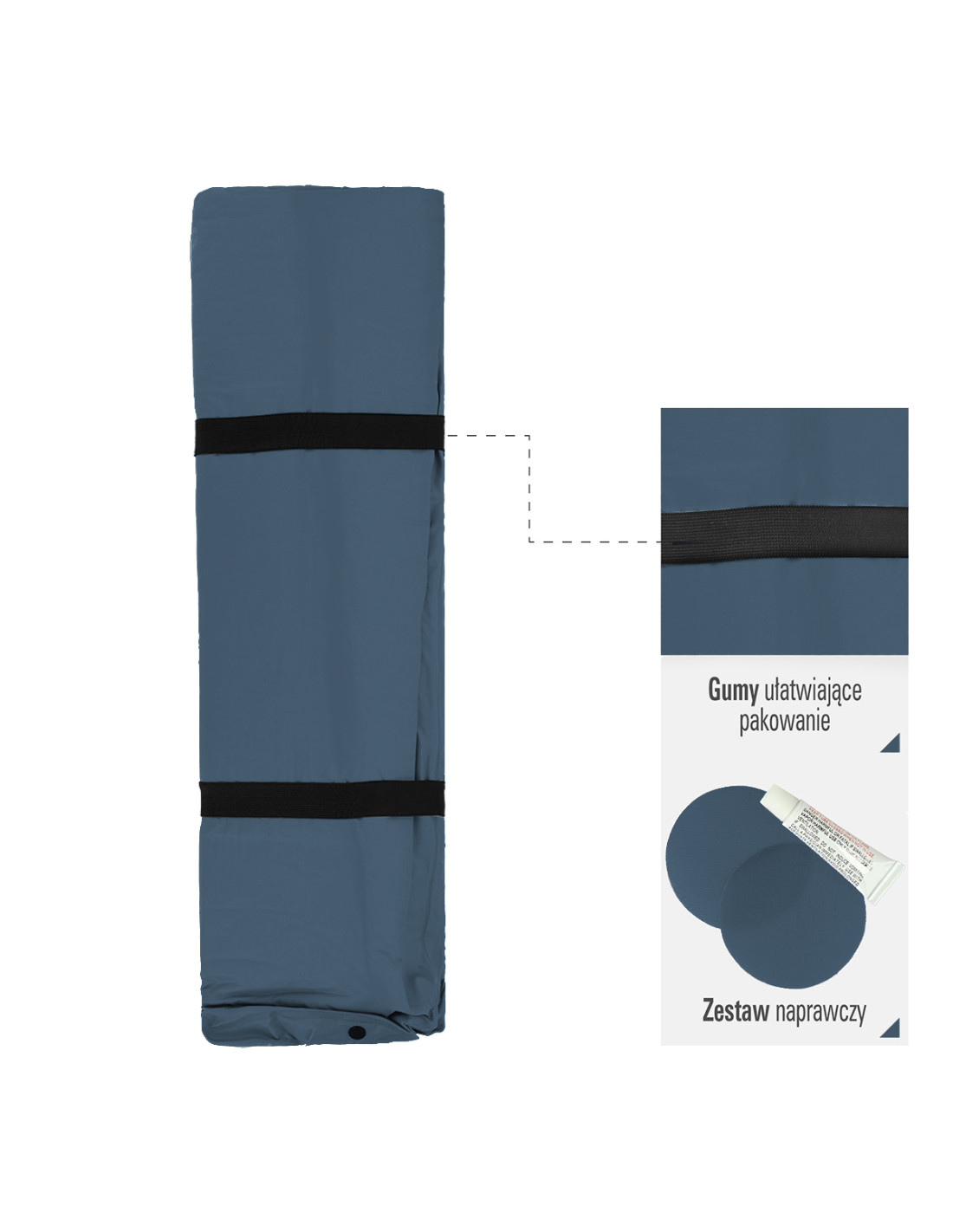 Навитата постелката е много компактна и навиването ѝ е много лесно. Просто развийте клапана и навийте постелката отгоре. Няма нужда да се притеснявате, че постелката ще се развие, защото е снабдена с две предпазни ленти. След като е навита, просто закопчайте лентите, за да я закрепите. Включен е и практичен защитен калъф, който значително улеснява транспорта и осигурява допълнителна защита срещу повреди.