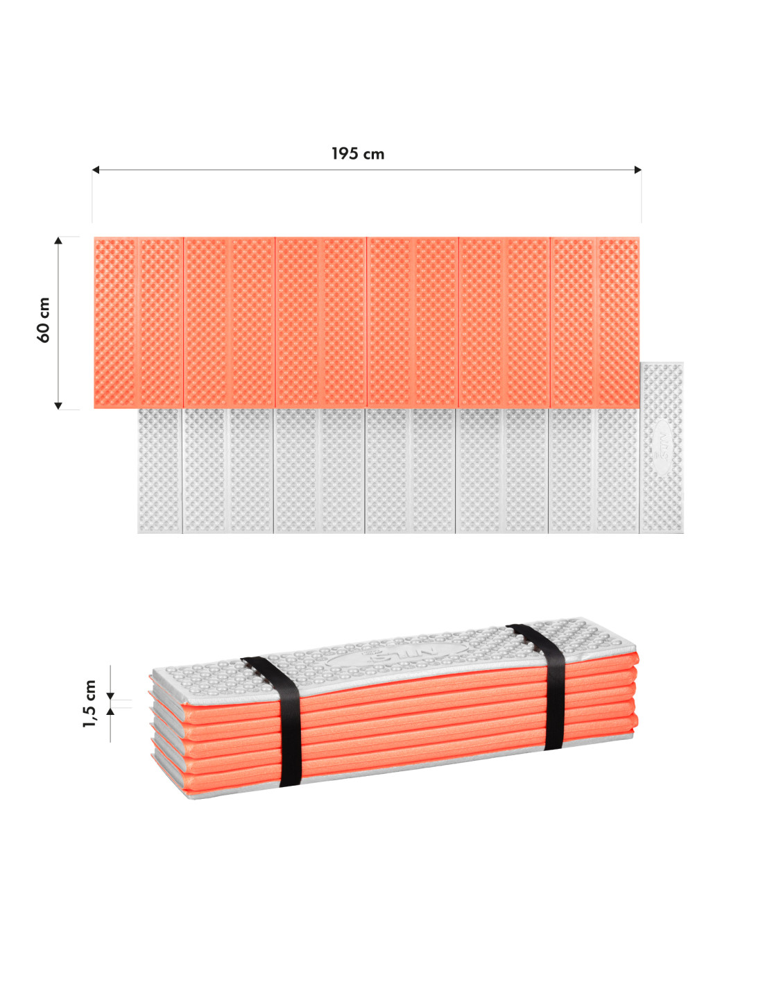 Постелката е с дължина 195 см, така че и по-високи хора могат да лежат удобно върху нея. С ширина от 60 см и дебелина от 1,5 см, осигурява удобна опора и изолация от земята, дори и на неравни повърхности.