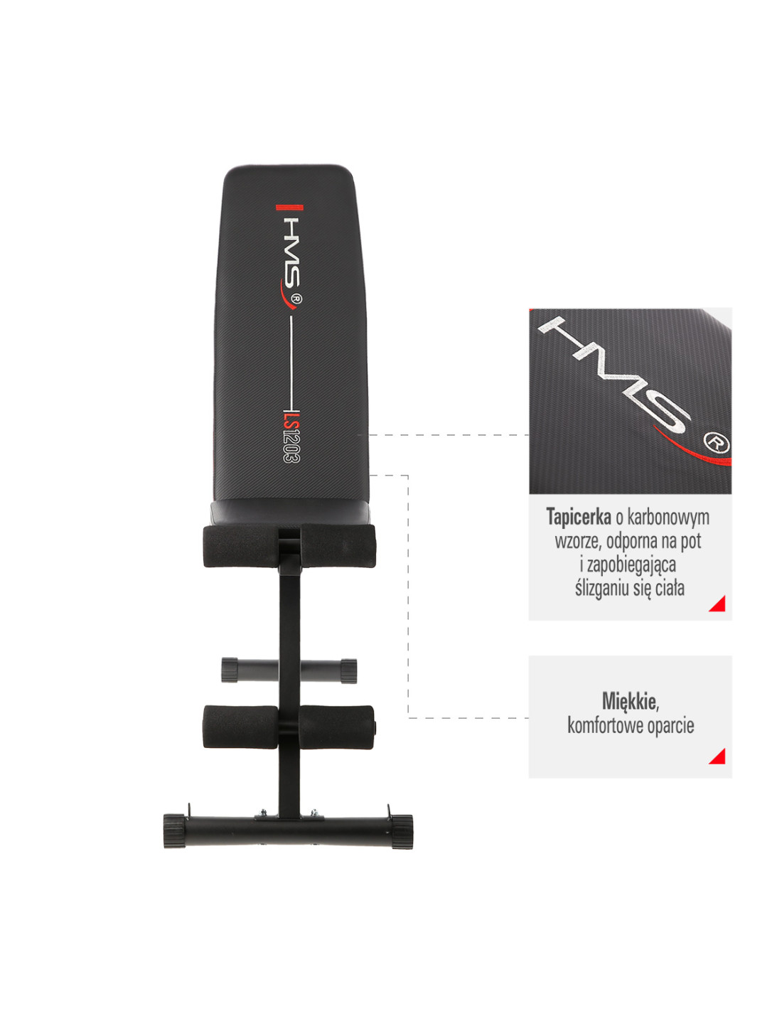 Тренировъчната пейка LS1203 HMS се отличава със здрава, солидна конструкция. Стоманените профили са комбинирани с широка седалка и облегалка, осигуряващи безопасност и издръжливост за години на използване.