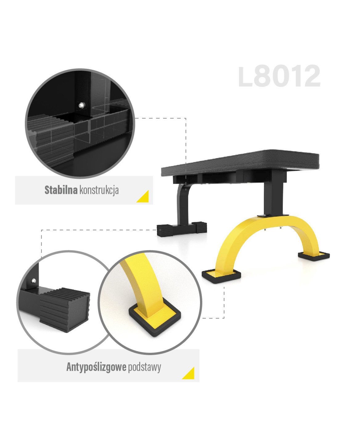 Здравата конструкция осигурява безопасност и комфорт, като позволява максимално натоварване от 200 кг. Въпреки здравата си конструкция, пейката е лека, което позволява лесна настройка навсякъде. Моделът L8012 е хоризонтална пейка, която няма регулируем ъгъл на облегалката. Това допринася за максимална стабилност.