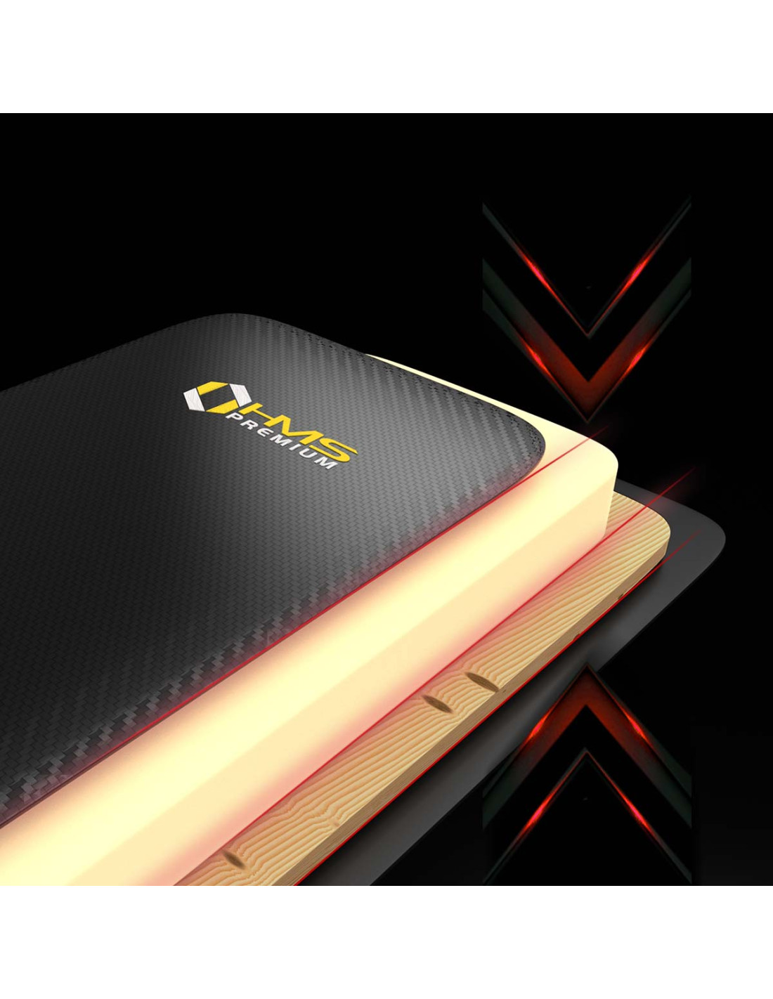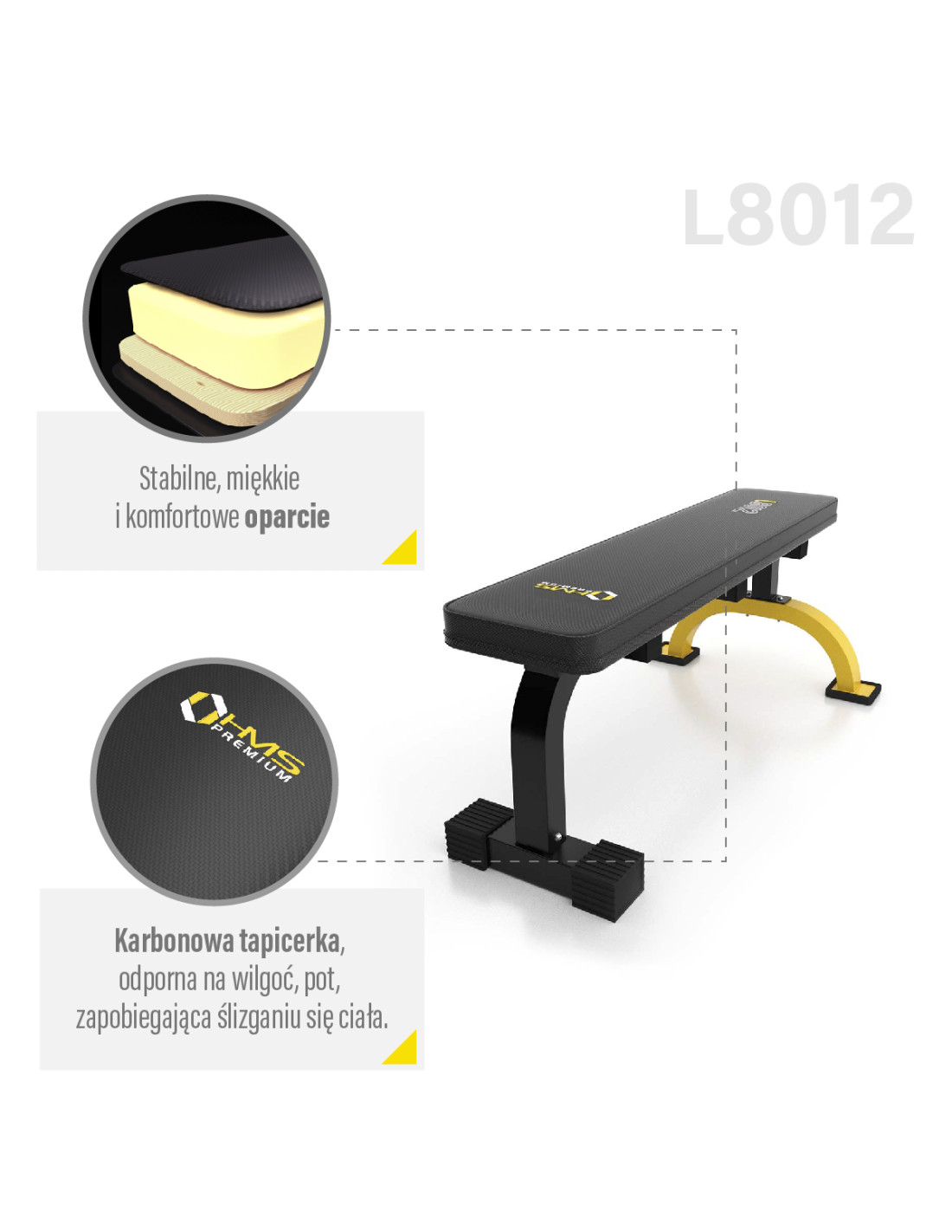 Тренировъчната лежанка е не само удобна и функционална, но и стилна. Комбинацията от черен карбонов материал и жълти бродирани елементи създава изключителния визуален ефект, който е характерен за марката HMS PREMIUM.