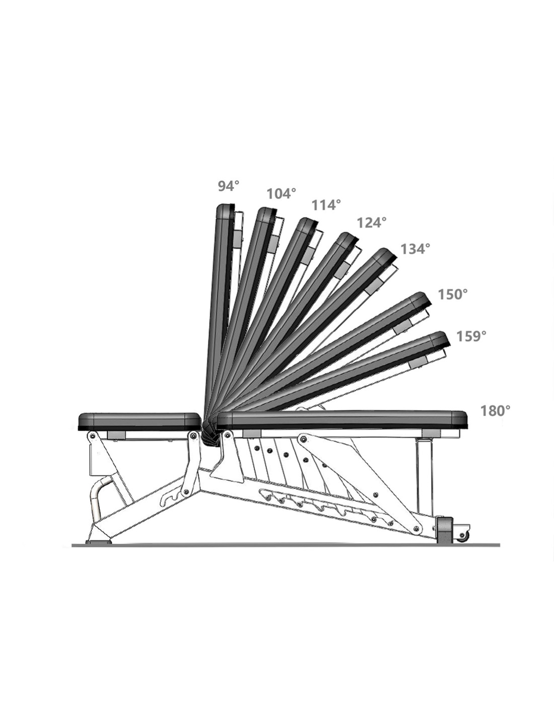 Пейката L1237 предлага 3 нива на регулиране на седалката и 8 нива на регулиране на облегалката, което ви позволява да персонализирате позицията за различни упражнения. Регулирането на облегалката варира от 94 градуса до 180 градуса, което позволява на потребителя да тренира както в изправено, така и в хоризонтално положение, както и в наклонено положение. Това позволява на потребителя ефективно и удобно да тренира различни мускулни области, от гърдите до раменете.