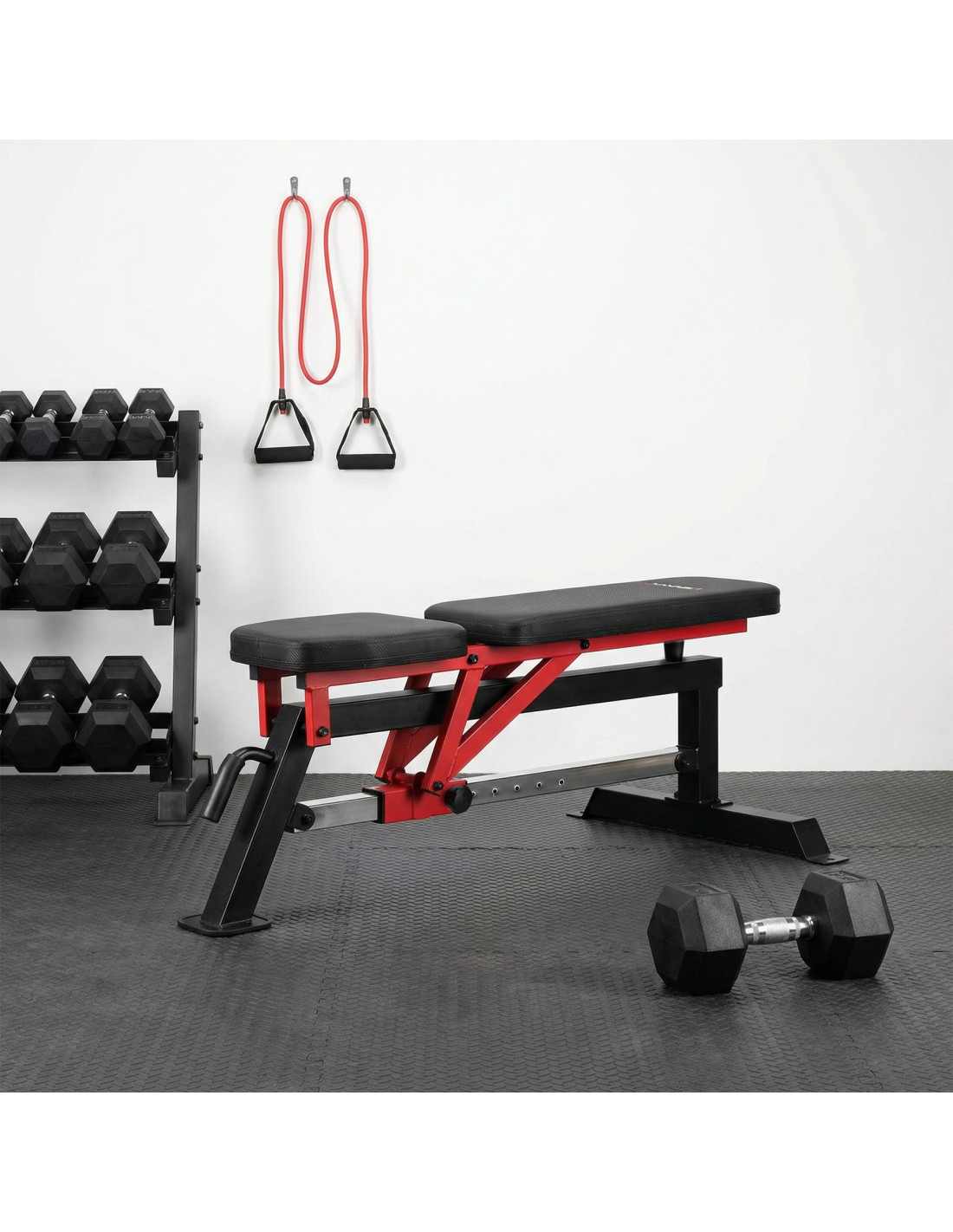 Транспортните колела и дръжката за носене позволяват лесно преместване или бързо съхранение на пейката след тренировка. Това практично решение спестява място и увеличава комфорта при ежедневна употреба.