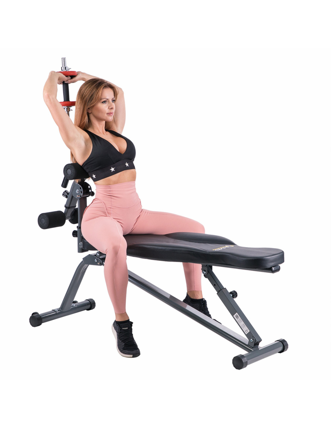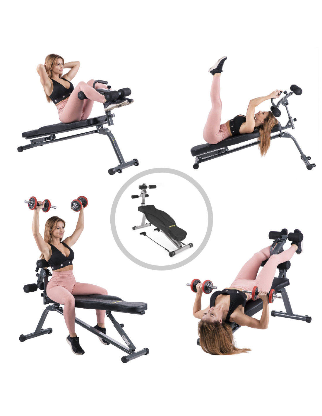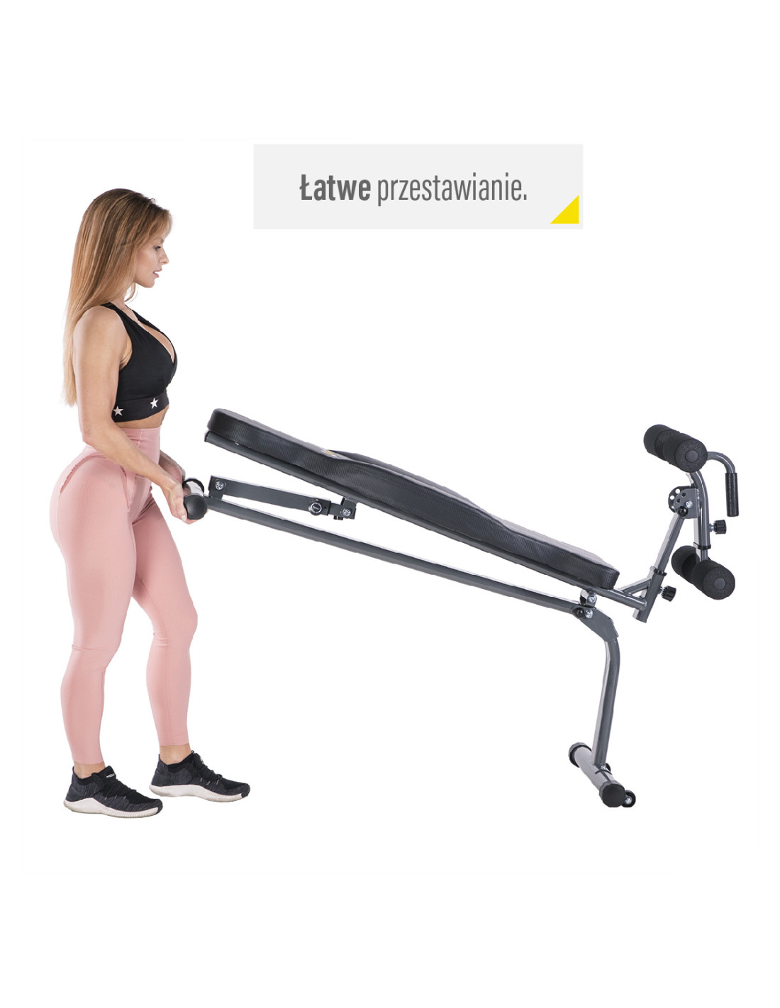 Тази тренировъчна пейка предлага широка гама от възможности за упражнения. Формата му го прави идеален за комбиниране със стойка за щанги. Подходящ е и за тренировка с дъмбели. По-ниската, наклонена позиция на лежанката (в легнало положение) дава възможност за коремни преси. Дръжката за крака осигурява комфорт и безопасност при изпълнение на упражнения, които ангажират силно коремните мускули.