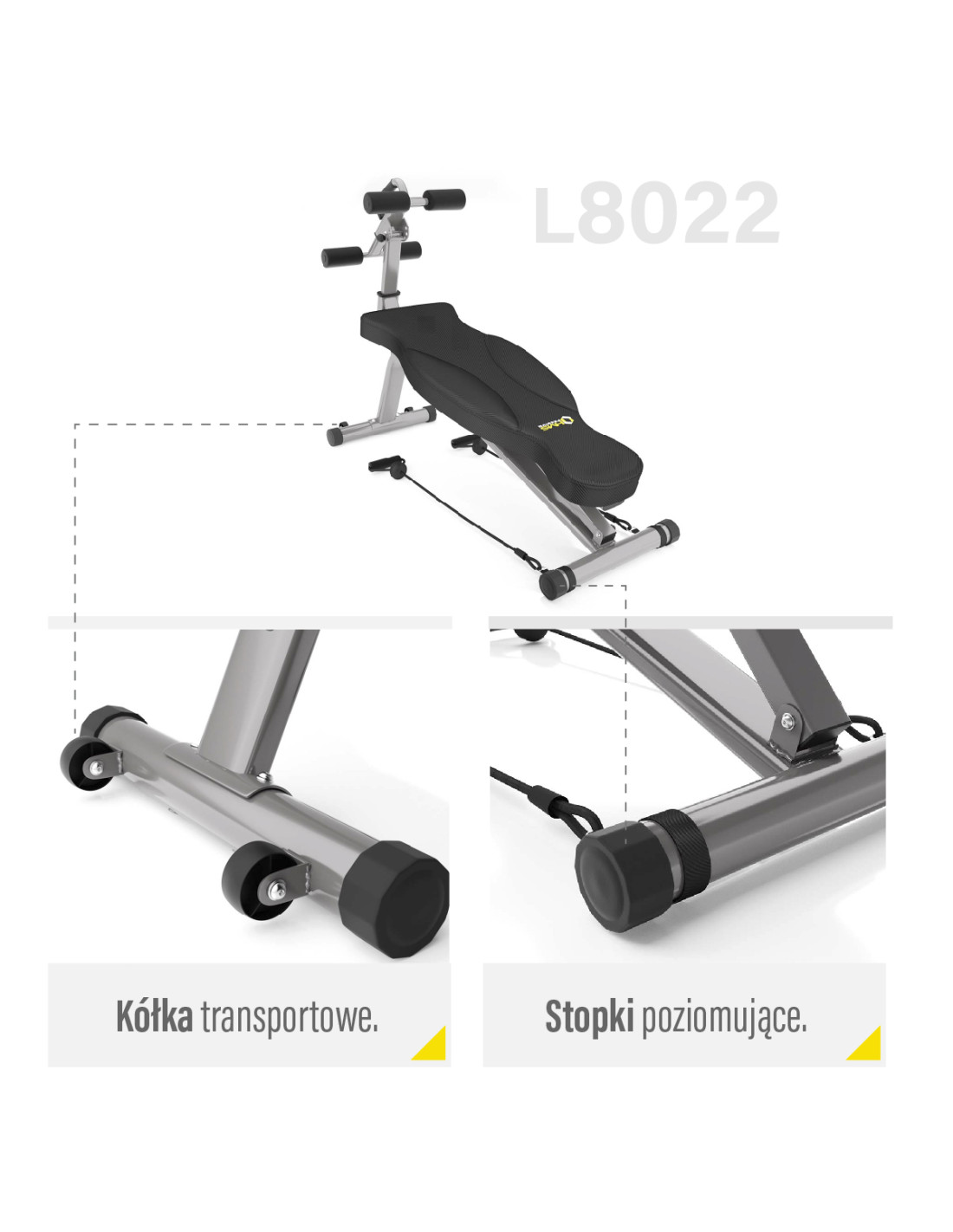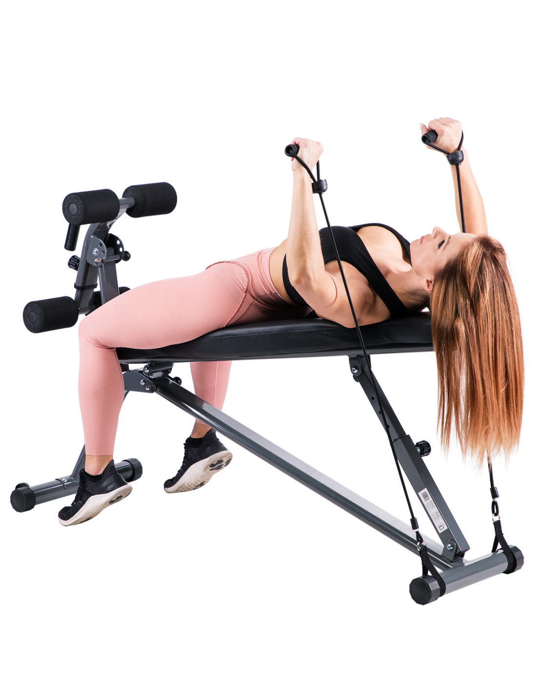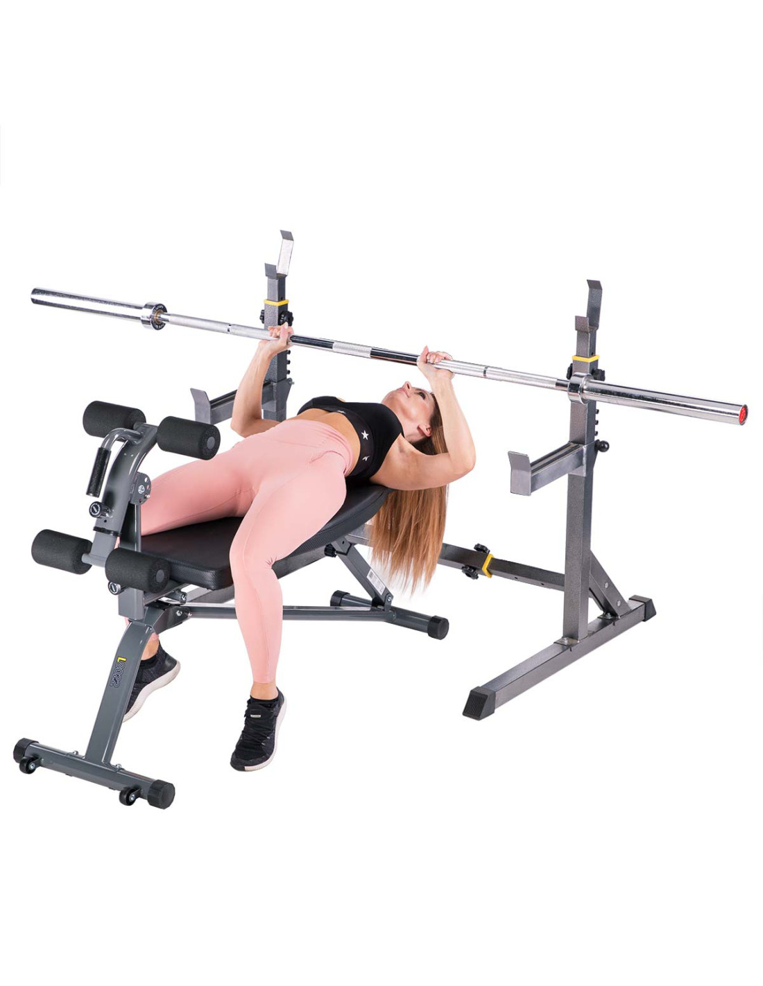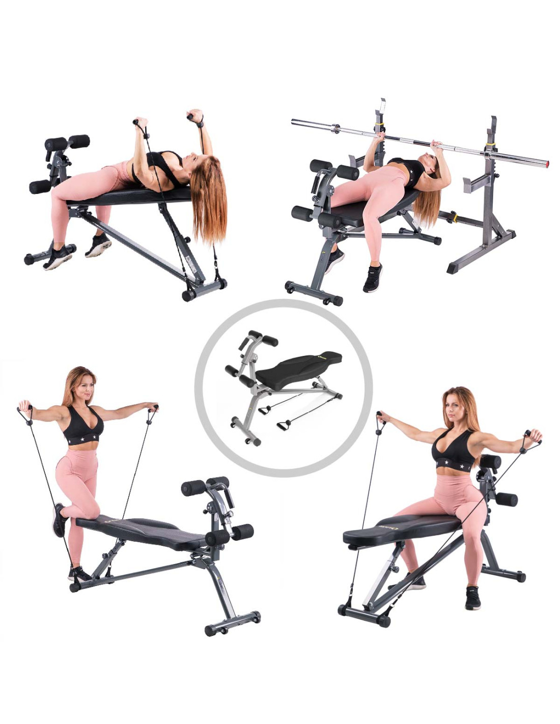 Тази тренировъчна пейка предлага широка гама от възможности за упражнения. Формата му го прави идеален за комбиниране със стойка за щанги. Подходящ е и за тренировка с дъмбели. По-ниската, наклонена позиция на лежанката (в легнало положение) дава възможност за коремни преси. Дръжката за крака осигурява комфорт и безопасност при изпълнение на упражнения, които ангажират силно коремните мускули.