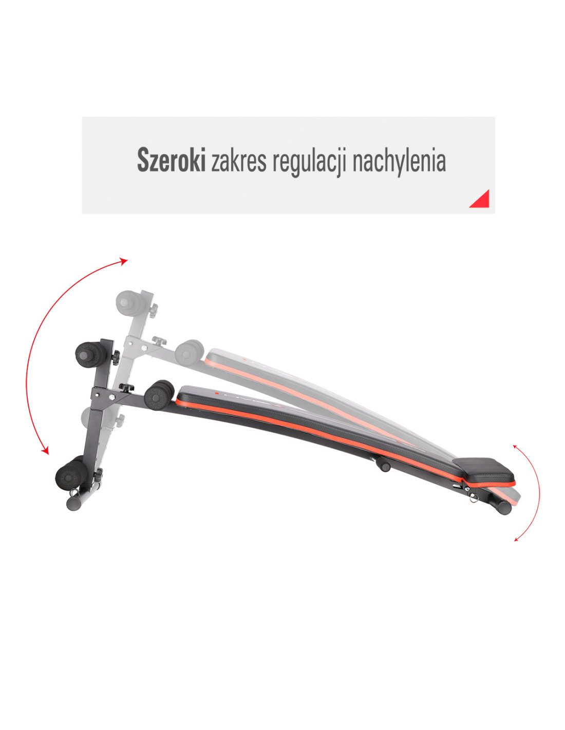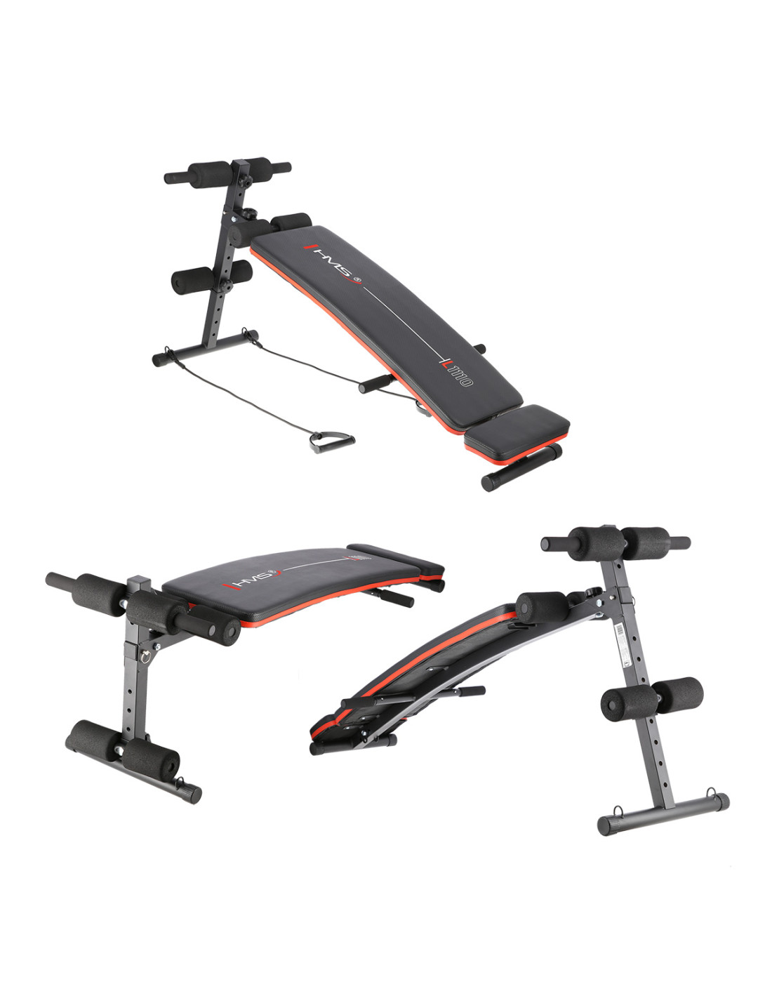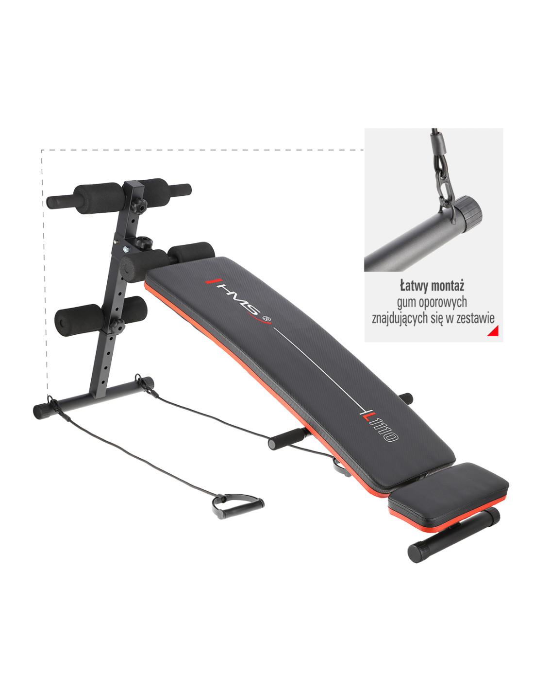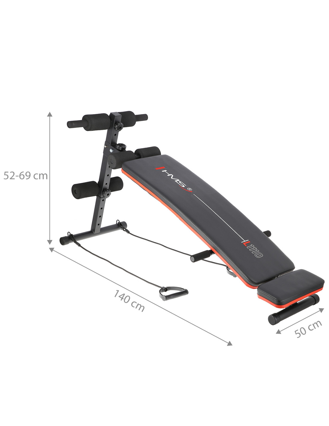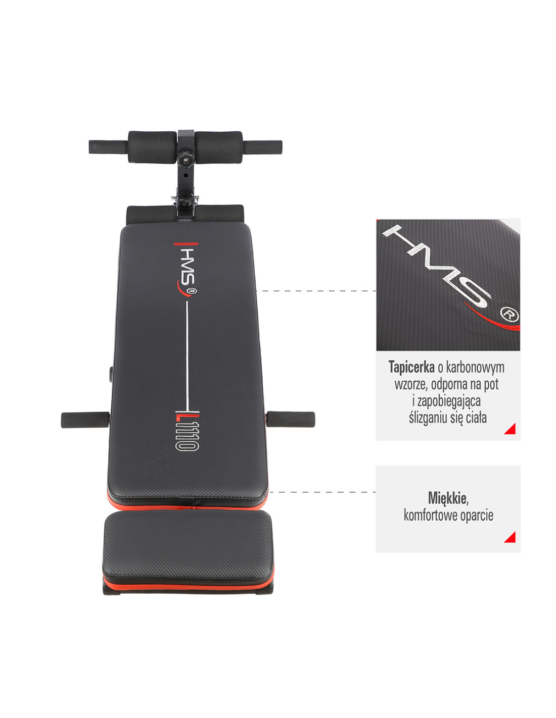 Тренировъчната лежанка L1110 HMS е не само стабилна, но и удобна. Меката пяна на облегалката и елементите от пяна на дръжките за лицеви опори осигуряват комфорт по време на вашата тренировка. Карбоновата подплата е не само стилна, но и устойчива на пот и предпазва тялото от подхлъзване по време на тренировка. Регулируемият ъгъл на наклон позволява трудността на упражнението лесно да се адаптира към нуждите на потребителя. Колкото по-висок е ъгълът на наклона, толкова по-интензивно е упражнението. Включени са и ленти за съпротивление, които могат да бъдат прикрепени към определено място, като по този начин добавят разнообразие към вашата тренировка. Съпротивителните ленти осигуряват широк спектър от упражнения, които могат да се изпълняват с този продукт.