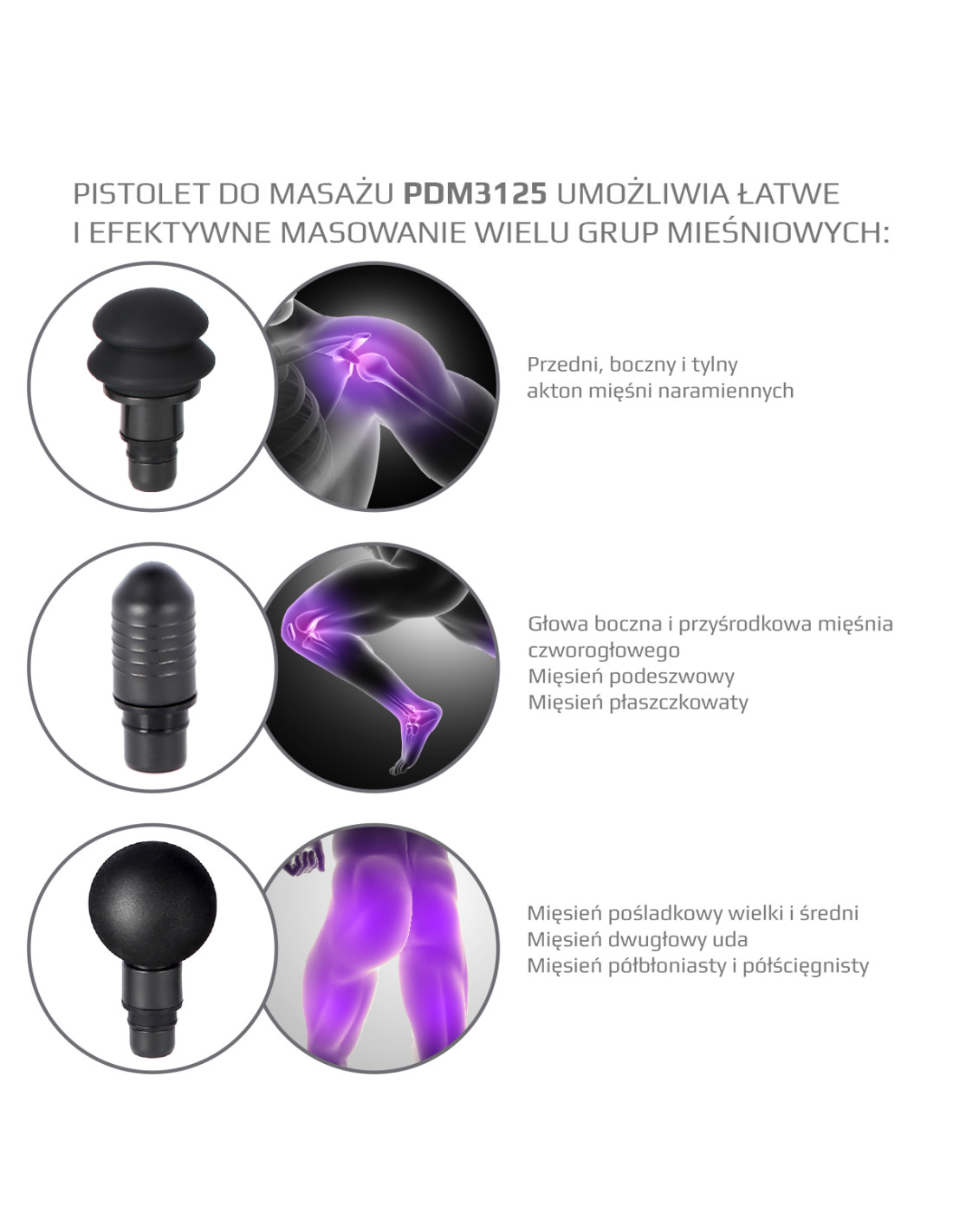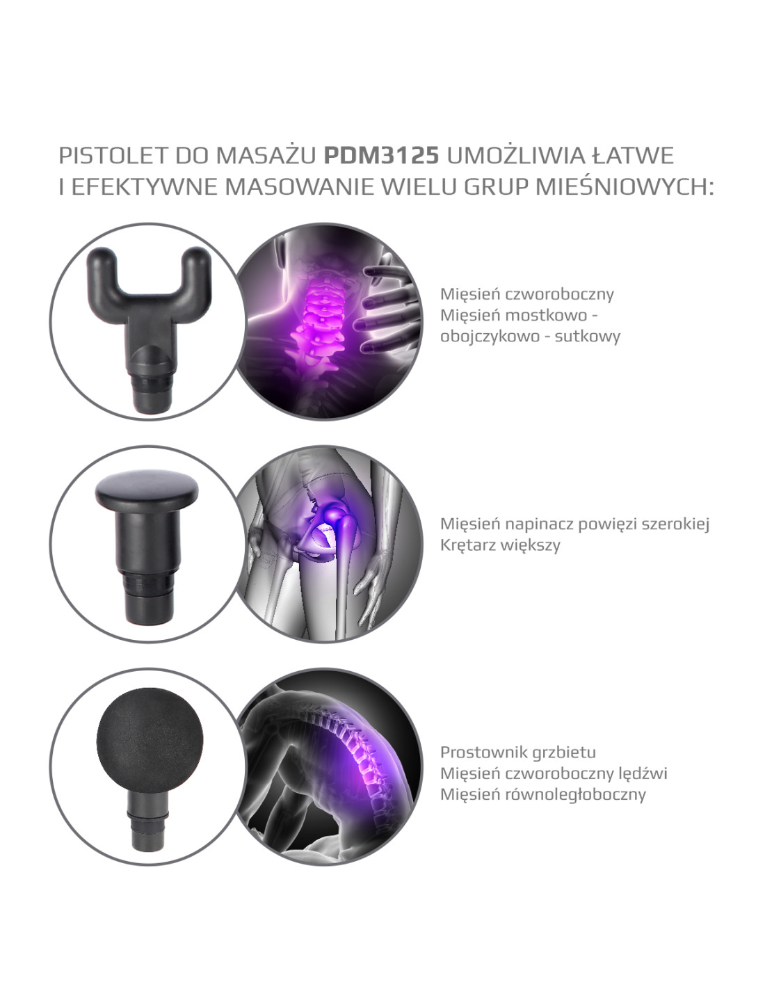 Die zweite Art betrifft neurologisch-physiologische Vorteile. Wenn Sie eine Massage mit einer Massagepistole durchführen, beeinflussen Sie die Muskelfaszie, genauer gesagt, die Rezeptoren, die sich auf ihr befinden. Diese Rezeptoren sind für die Muskelspannung verantwortlich. Deshalb können wir mit Sicherheit sagen, dass Sie mit dem Produkt PDM3125 die Muskeln entspannen und die Heilung von Mikroverletzungen, d.h. des sogenannten Muskelkaters, beschleunigen.
