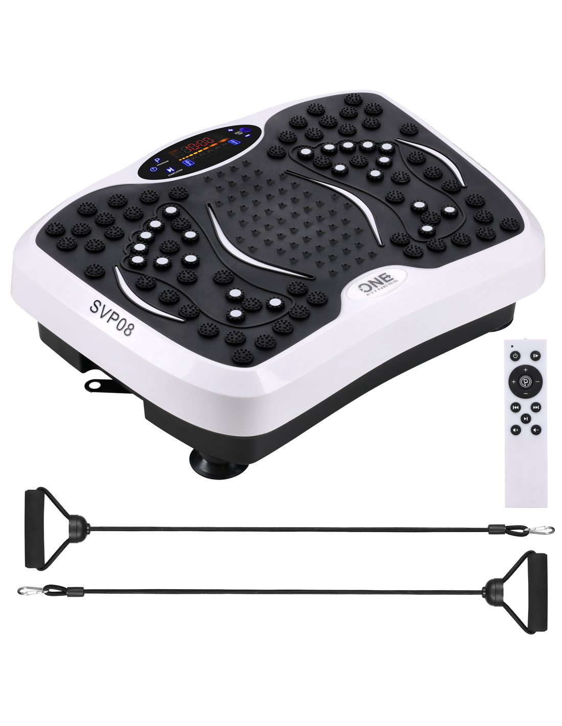 Платформата SVP08 се предлага с ластици за съпротивление , които позволяват едновременна тренировка на горната и долната част на тялото. Това прави вибрационната платформа универсално фитнес устройство за силови, кондиционни и оформящи тялото тренировки.