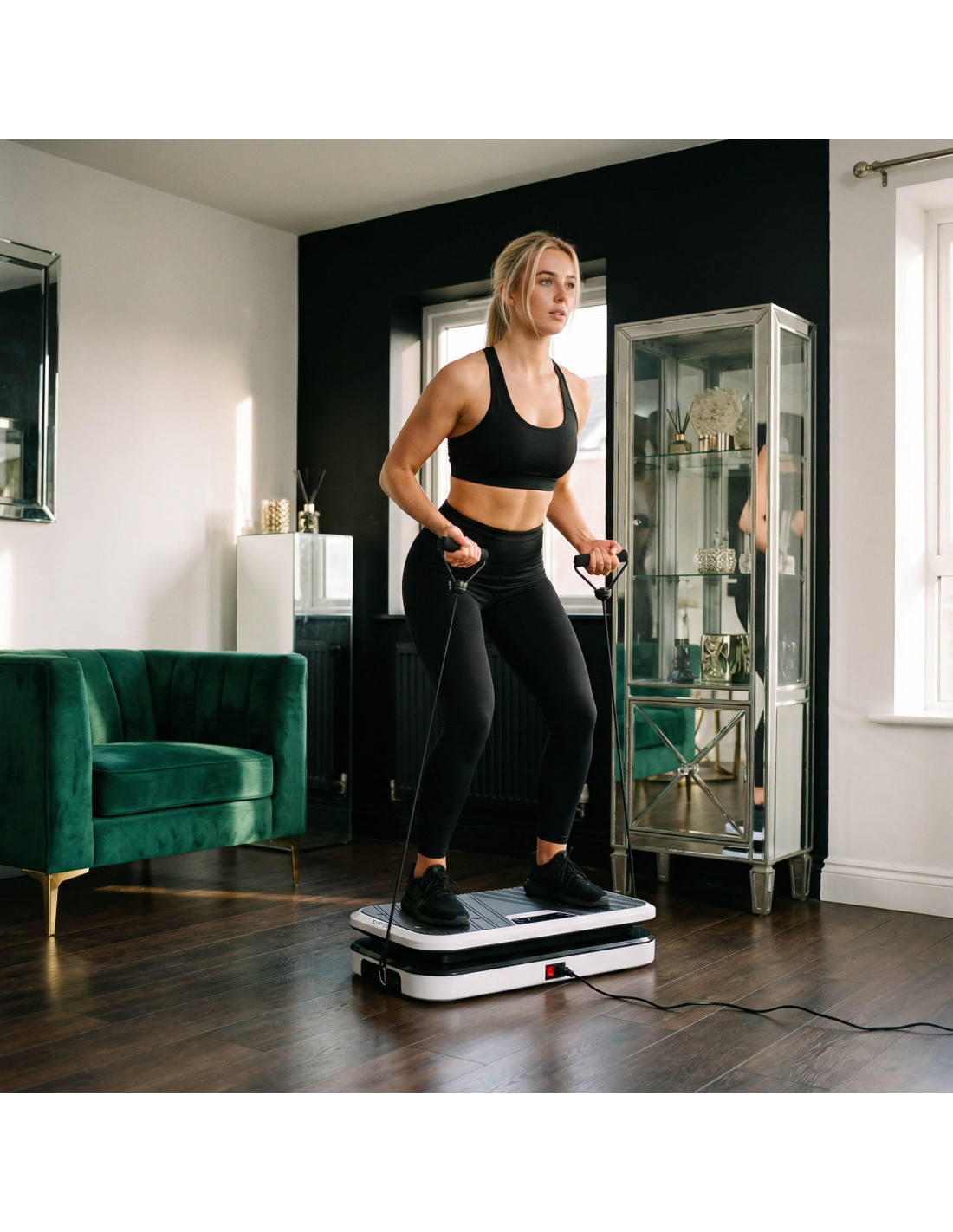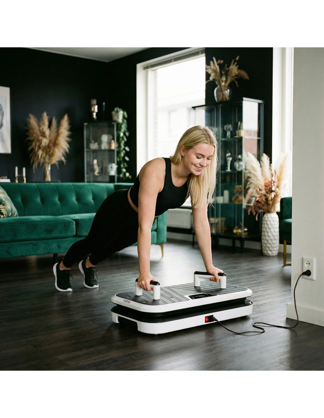Платформата е снабдена с ластици за съпротивление , които позволяват едновременна тренировка на горната и долната част на тялото. Допълнително предимство са дръжките за лицеви опори , които могат да се закрепят в различни позиции, което значително увеличава броя на възможните упражнения и позволява цялостна тренировка на цялото тяло върху вибрационна платформа.