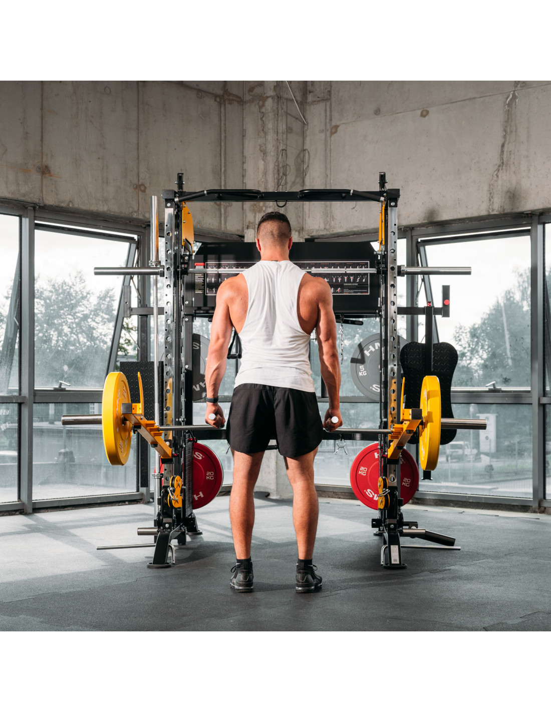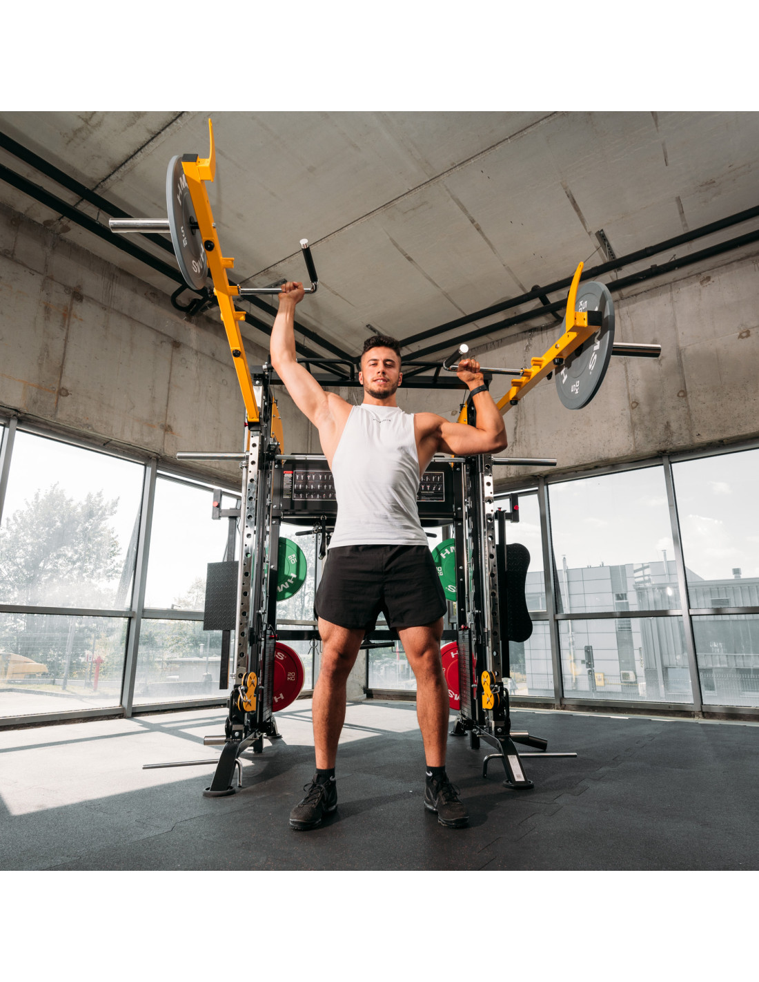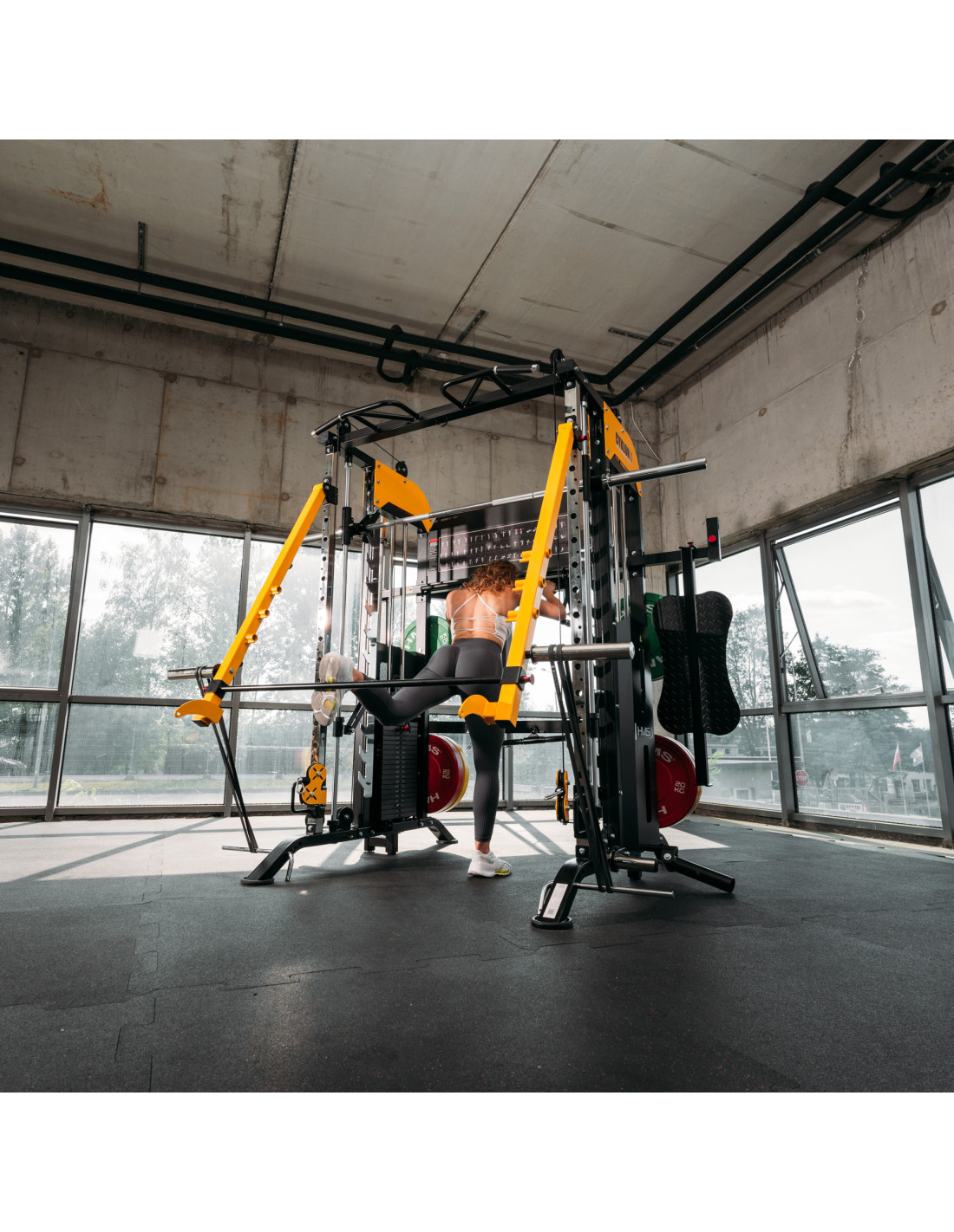 Smith's Überkopfkran - mit einer integrierten Stange, die es Ihnen ermöglicht, isolierte Übungen mit schwereren Gewichten durchzuführen. Dank des Sicherheitssystems können Sie trainieren, bis Ihre Muskeln zusammenbrechen.