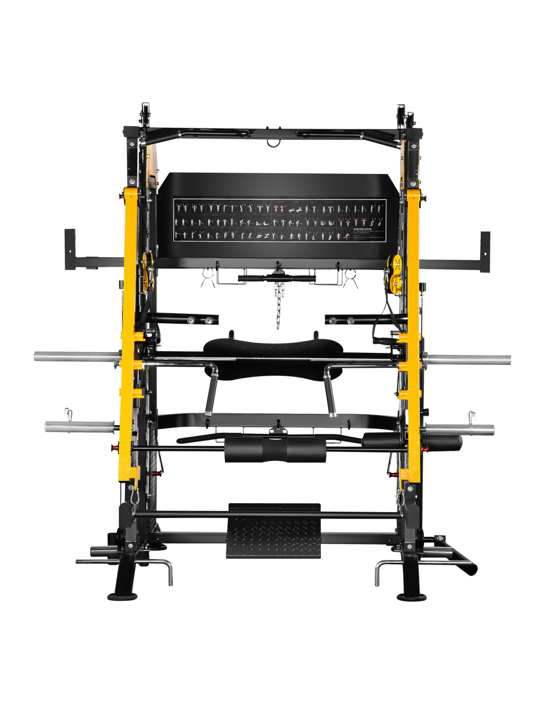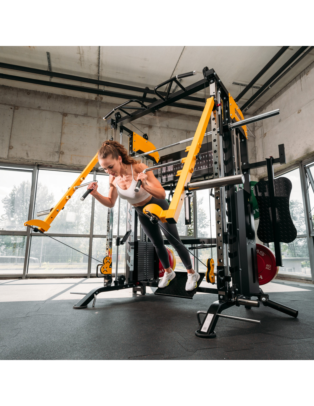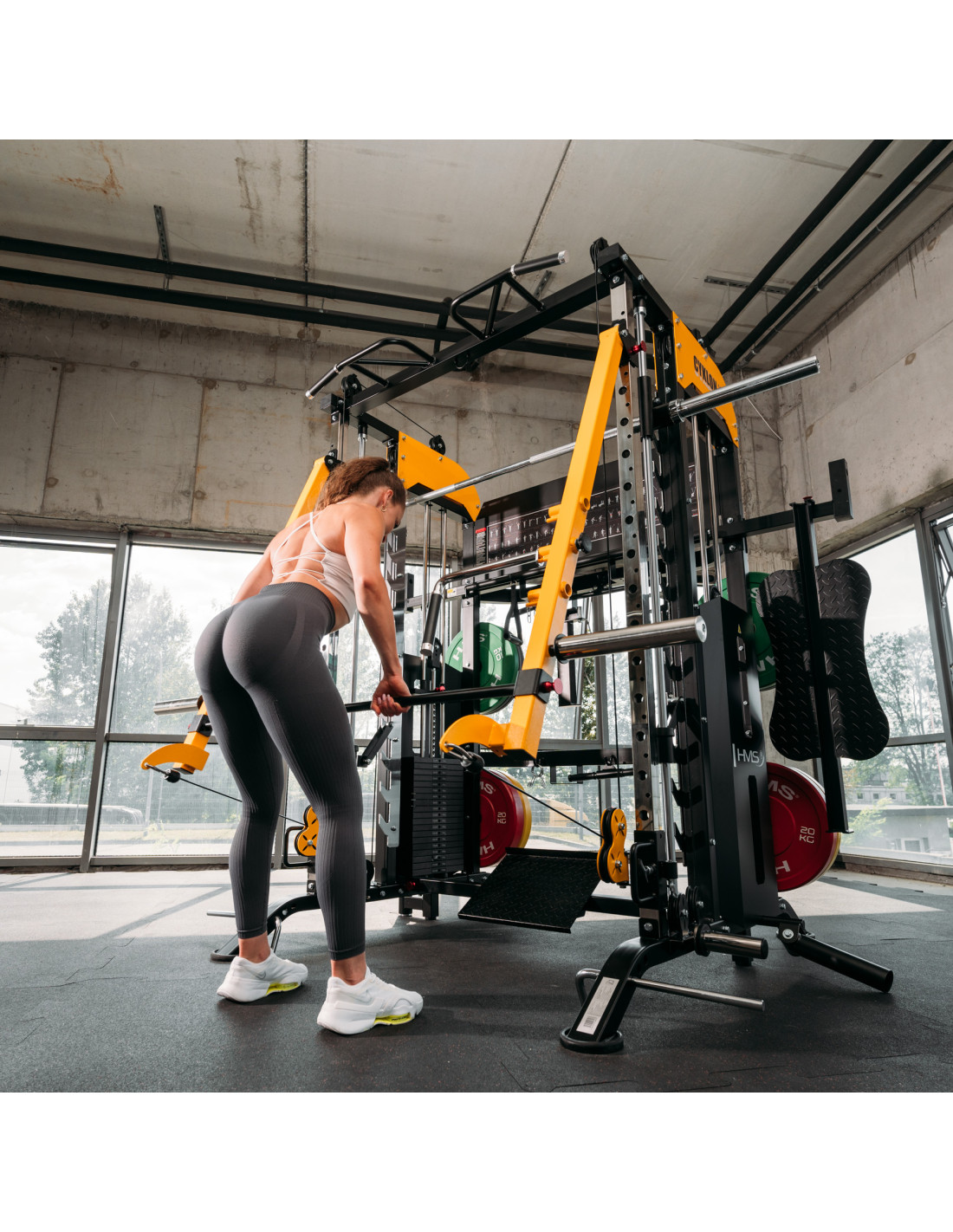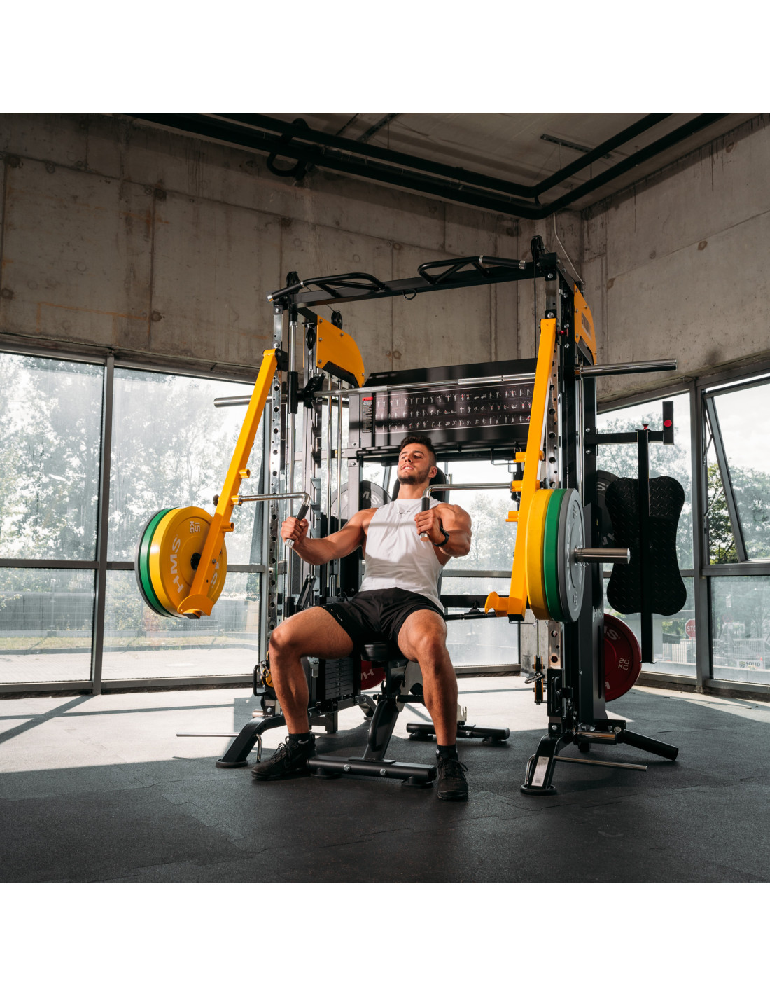 Smith's Überkopfkran - mit einer integrierten Stange, die es Ihnen ermöglicht, isolierte Übungen mit schwereren Gewichten durchzuführen. Dank des Sicherheitssystems können Sie trainieren, bis Ihre Muskeln zusammenbrechen.