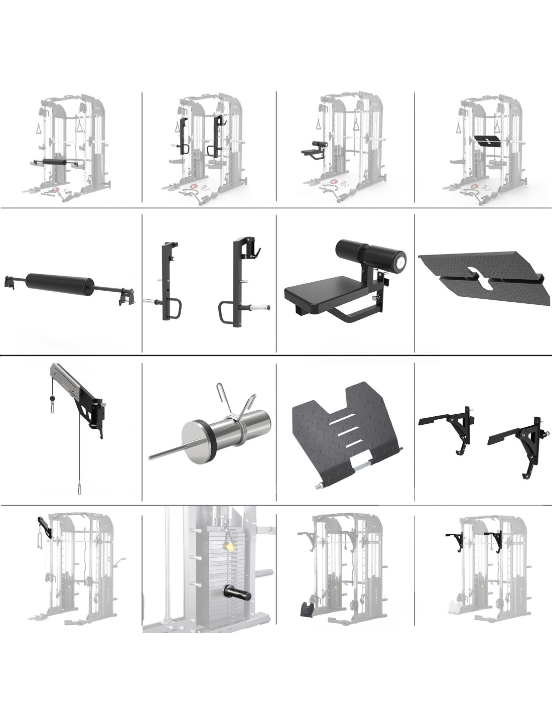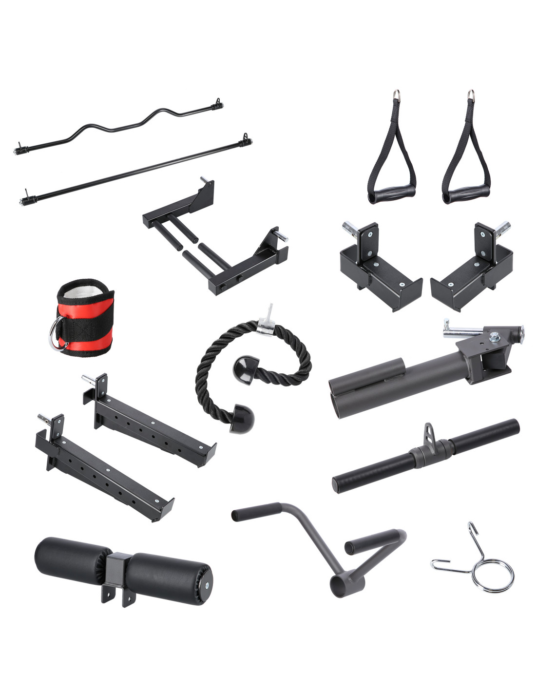 Дръжки - Комплектът включва различни дръжки, а именно: класически дръжки, дръжки за щанга, права дръжка, дръжка за къдрици, каишки за крака, въже за трицепс, паралелна дръжка, къс лост, държач за противопехотна мина, държач за съхранение на щанга, куки за ластици и три вериги.