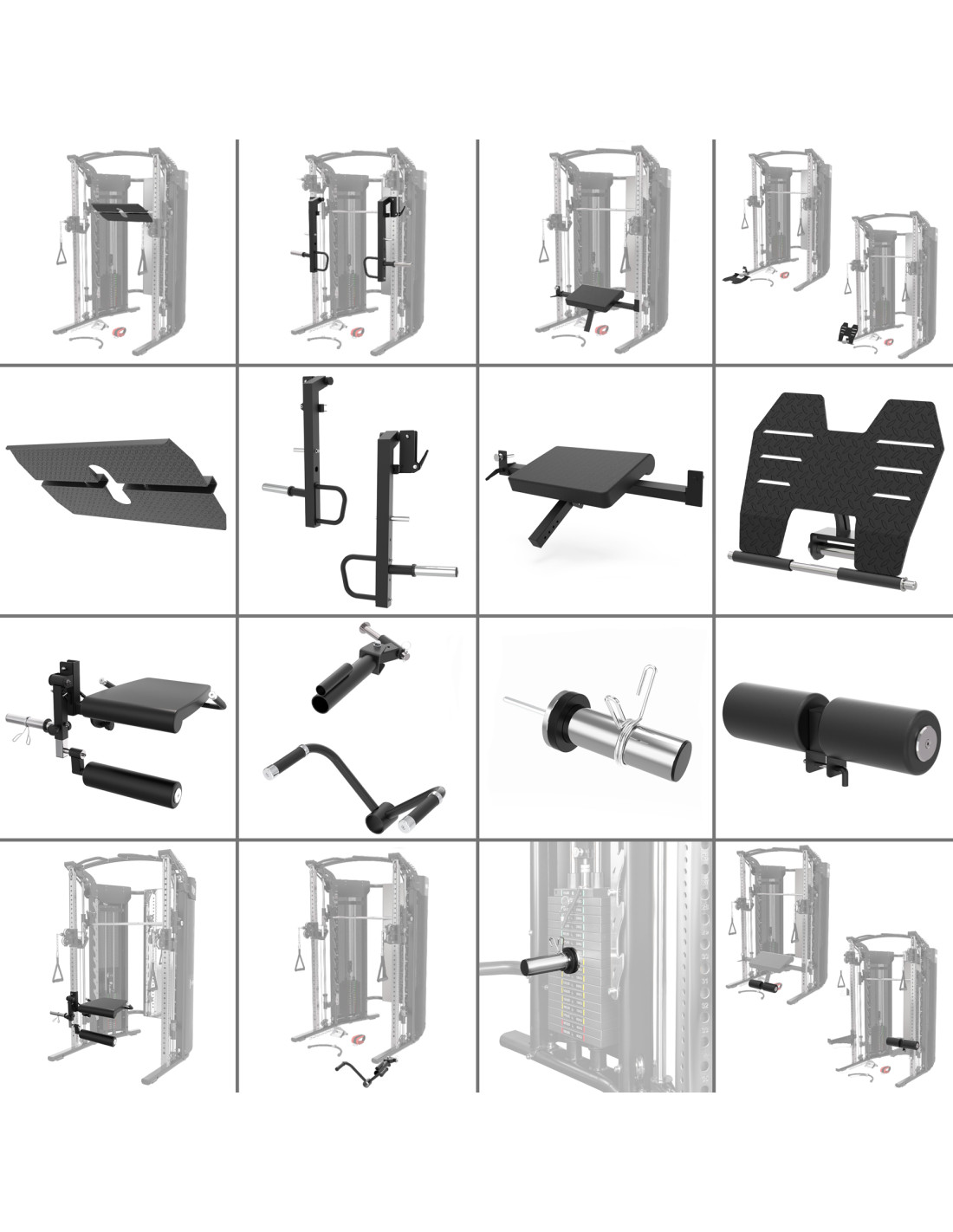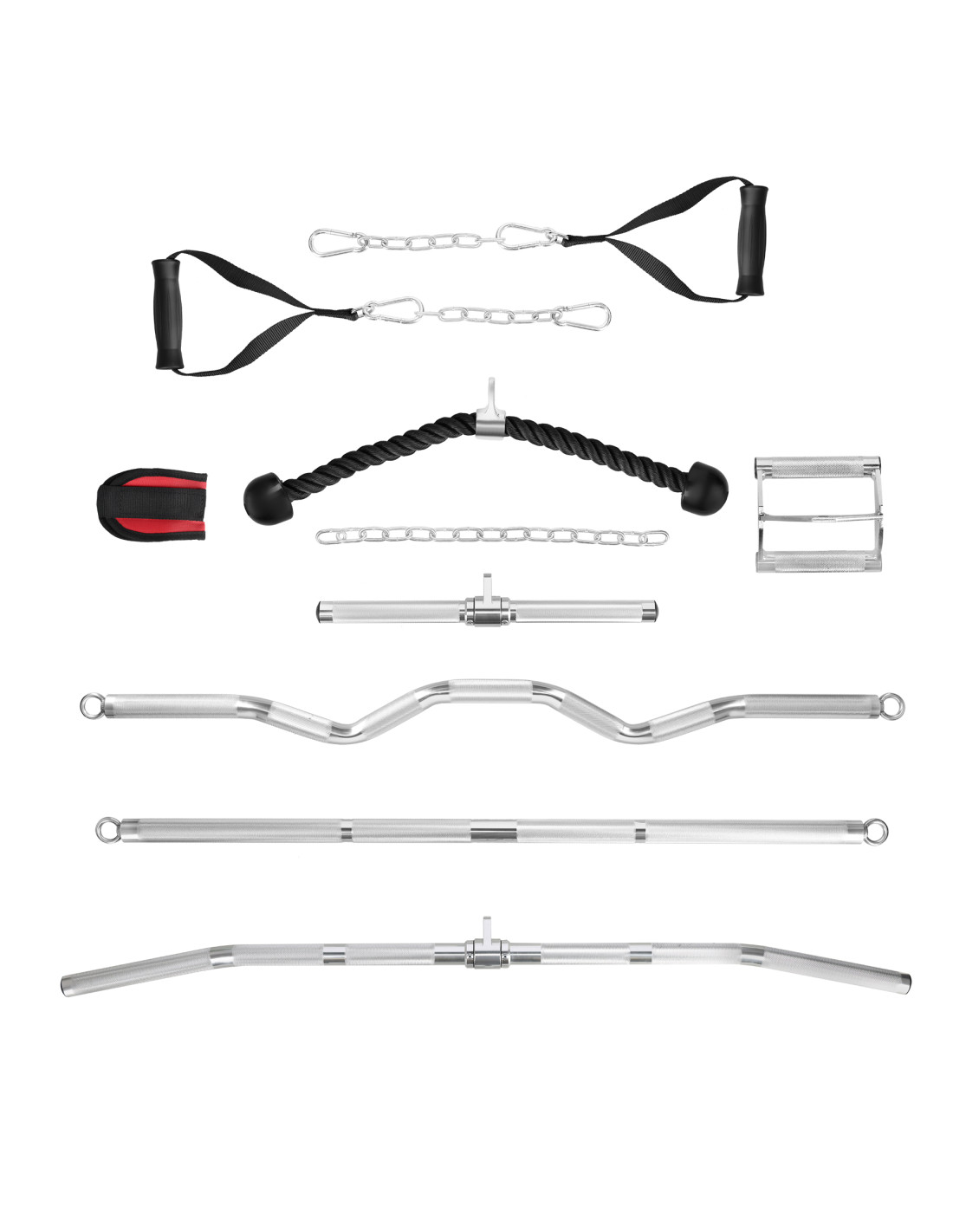 Пълен пакет от дръжки с кабелни макари за гръб, гърди, рамене, ръце, седалищни мускули и коремни мускули: 2× единични D-образни дръжки, въже за трицепс, двойна дръжка за гребане с тесен хват, вериги, каишка за глезена, къс прав лост, EZ лост за сгъване, дълъг прав лост за лат, дълъг ъглов лост за лат.