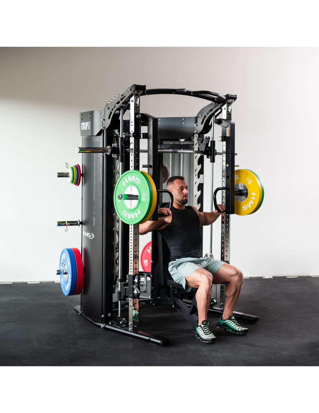 CYKLOP 10 е усъвършенствана тренировъчна станция – цялостно 3-в-1 решение, което комбинира машина Smith, силова стойка и кабелен/функционален тренажор. С два прецизни селекторни стека от 90 кг и интелигентен механизъм за свързване на лоста Smith към стека, можете да тренирате със свободни тежести, със селекторния стек – или… и с двете едновременно. Една машина, която замества половината от фитнес залата.