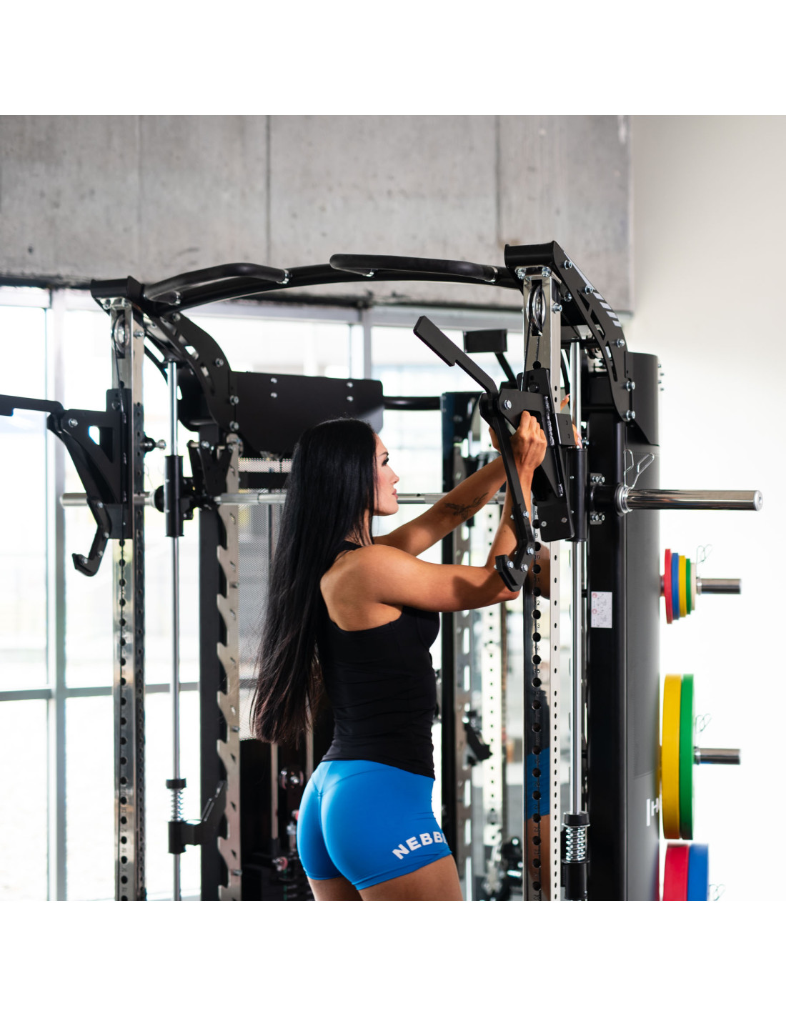 Две независими противотежести с тегло 2x90 кг се движат върху алуминиеви ролки с лагери . Шарнирните напречни ролки позволяват свободно движение във всяка посока, а прецизната скала на отворите позволява точното позициониране на дръжките и аксесоарите, за да отговарят на вашите телесни мерки.