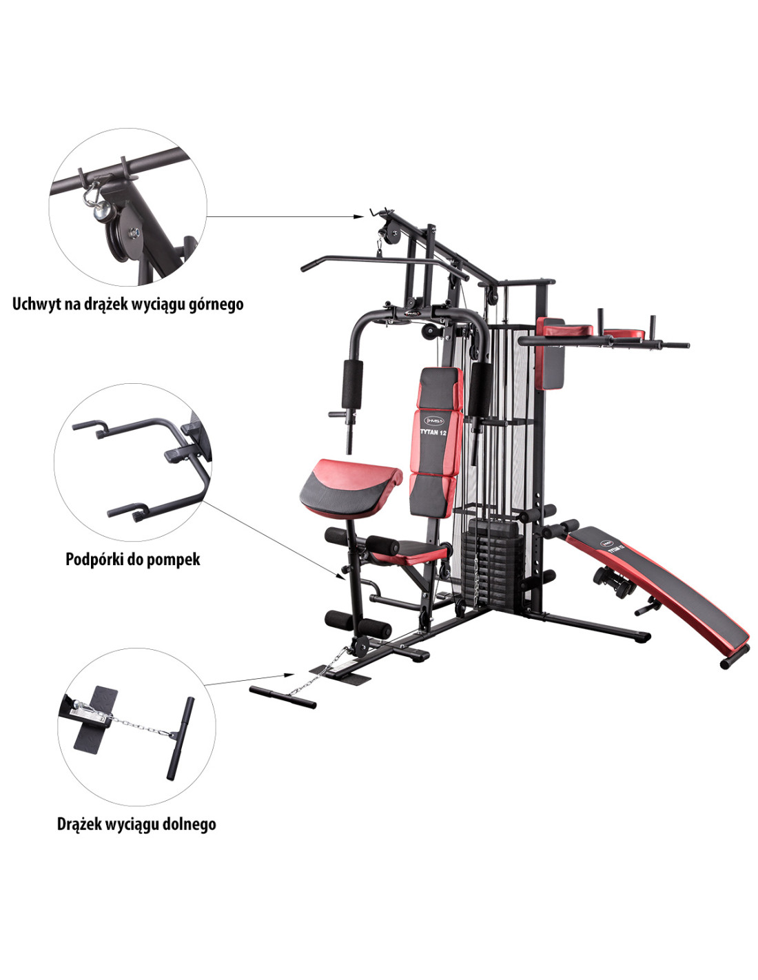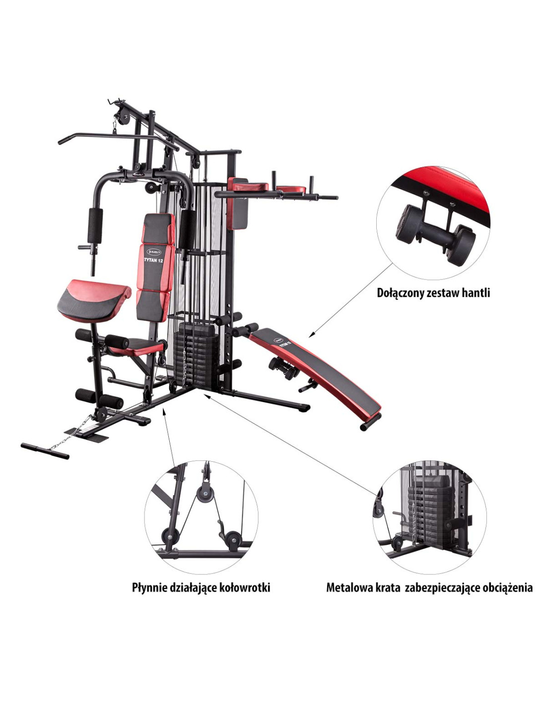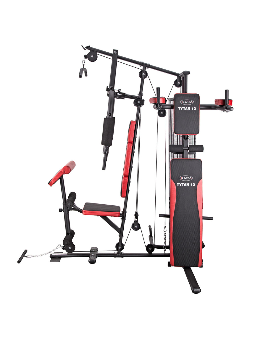 TYTAN 12 HMS multi-gym е модерна мулти-гимнастика за силови тренировки. Тази универсална машина ще задоволи и най-взискателните потребители. Той съчетава функциите на наклонена пейка, станция за издърпване с кабел и лат, тренировъчна станция за крака и корем и лицеви опори. Тази широка гама от функции прави тази мултифункционална зала идеална за тези, които искат редовно да изграждат мускули. Мултифитнес зала TYTAN 12 HMS разполага с удобна седалка. Комфортът се осигурява от издръжлива пяна и модерна, издръжлива тапицерия с карбонов модел. Специално контурен дизайн стабилизира позицията на потребителя. TYTAN 12 multi-gym ви позволява безопасно да тренирате различни мускулни групи – точно като в професионална фитнес зала. Високото качество на тази машина гарантира безпроблемна работа за дълъг период от време. От рамката, изработена от издръжлива, прахово боядисана стомана до макарата и кабелната система, машината отговаря на най-високите технически стандарти.