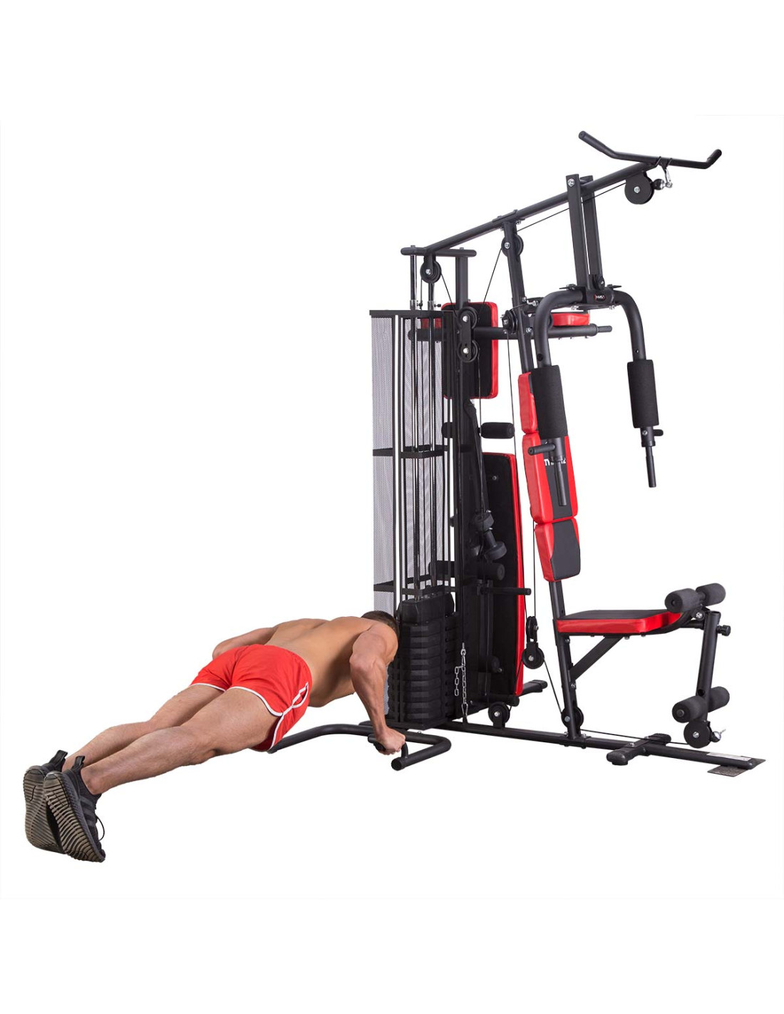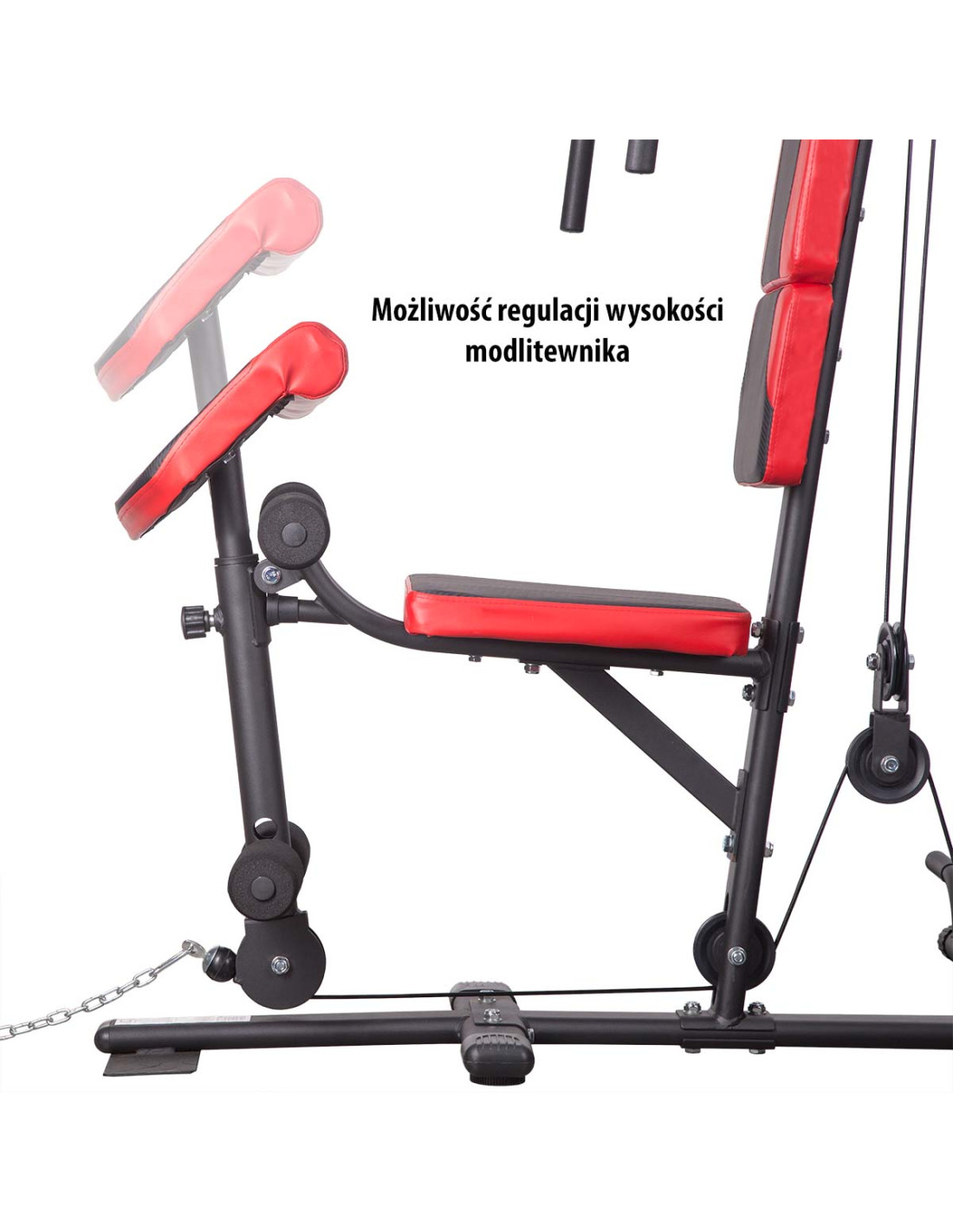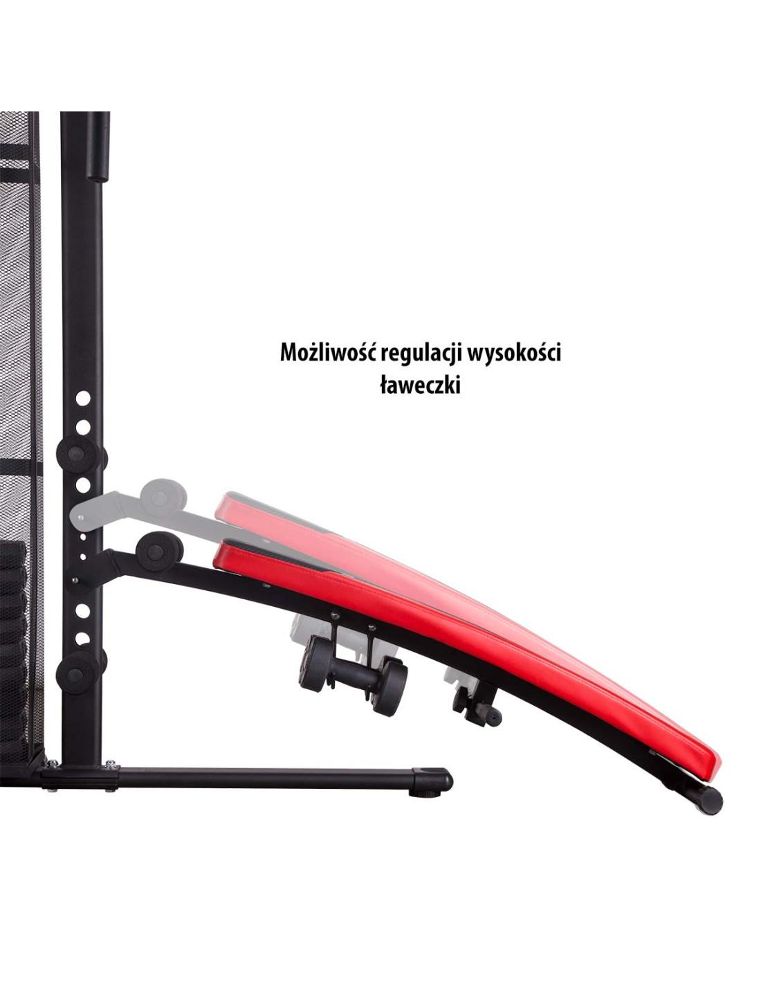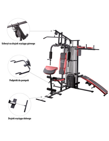 TYTAN 12 HMS multi-gym е модерна мулти-гимнастика за силови тренировки. Тази универсална машина ще задоволи и най-взискателните потребители. Той съчетава функциите на наклонена пейка, станция за издърпване с кабел и лат, тренировъчна станция за крака и корем и лицеви опори. Тази широка гама от функции прави тази мултифункционална зала идеална за тези, които искат редовно да изграждат мускули. Мултифитнес зала TYTAN 12 HMS разполага с удобна седалка. Комфортът се осигурява от издръжлива пяна и модерна, издръжлива тапицерия с карбонов модел. Специално контурен дизайн стабилизира позицията на потребителя. TYTAN 12 multi-gym ви позволява безопасно да тренирате различни мускулни групи – точно като в професионална фитнес зала. Високото качество на тази машина гарантира безпроблемна работа за дълъг период от време. От рамката, изработена от издръжлива, прахово боядисана стомана до макарата и кабелната система, машината отговаря на най-високите технически стандарти.