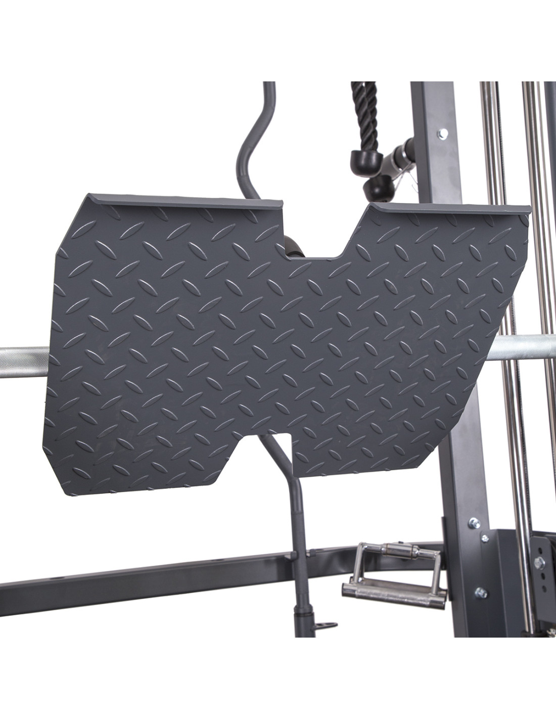 Поставката за крака може да се прикрепи към щангата, което позволява да се използва като лег преса. След това щангата се избутва нагоре с краката ви. През това време лежите на постелката. Сглобяването е много лесно, а допълнителните функции за безопасност гарантират вашата безопасност. В тази позиция можете да тренирате не само квадрицепсите, но и глутеусите. Това упражнение значително разтяга глутеусите, което оказва влияние върху неговата ефективност. Колкото по-голям е обхватът на движение, толкова по-добре се разтягат мускулите и по-добри са резултатите от тренировката.