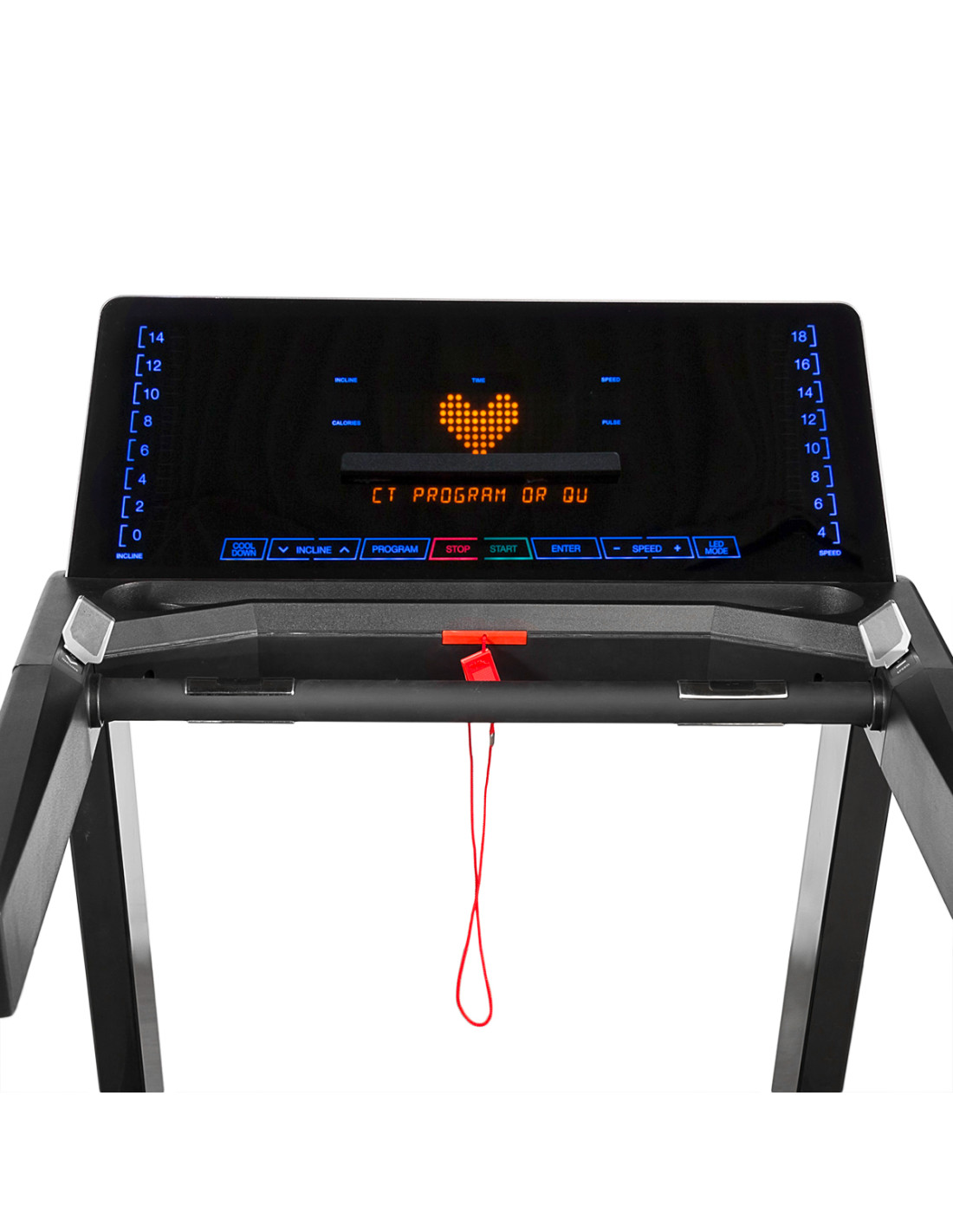 - Trainingsprogramme: 30 (20 Standardprogramme, 4 Einstellungsmöglichkeiten der eigenen Programme, 2 HRC-Programme (Der Laufband passt die Geschwindigkeit und den Neigungswinkel an Ihre Herzfrequenz - 60% und 80% der maximalen Herzfrequenz - an.), THR-Programm (Sie können dadurch Ihr eigenes Herzfrequenzniveau einstellen), „Low speed“-Programm (für ältere Personen geeignet), "Cool down"-Programm (Beruhigung des Organismus, Dabei senkt die Geschwindigkeit stufenweise.), das letzte Programm ist manuelles Programm (Jeder Parameter wird von einem Nutzer eingestellt.)