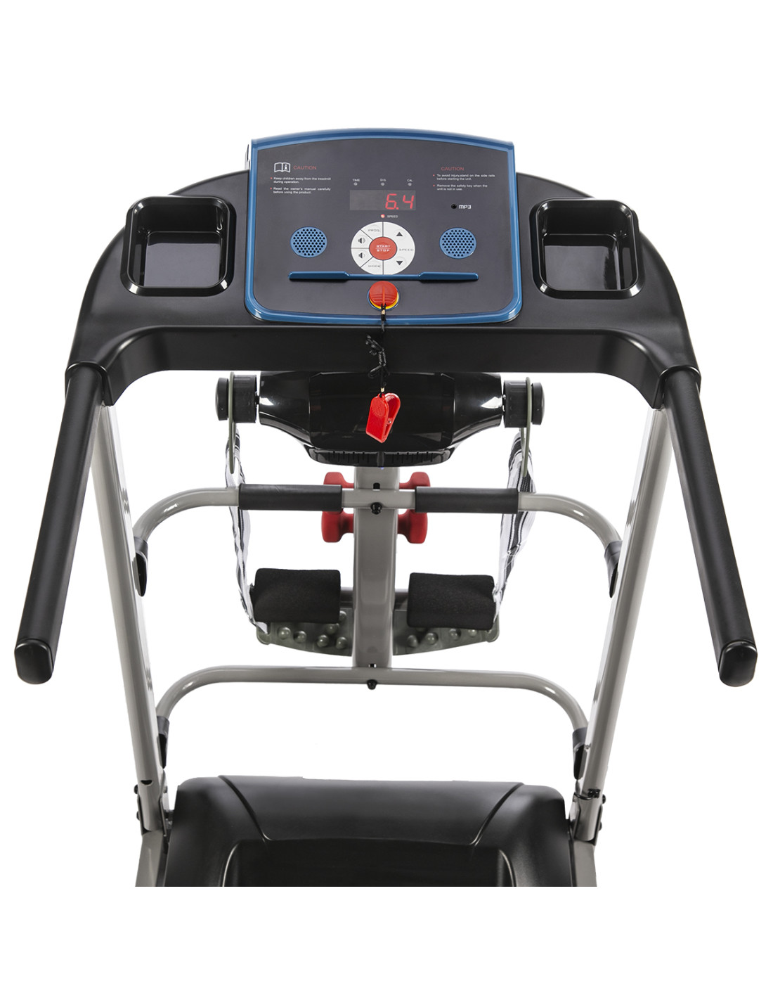 Неговият размер и амортисьорна система осигуряват комфорт по време на тренировка. Ергономичният контролен панел ви позволява да задавате различни функции: време, скорост и разстояние. Това устройство също така разполага с вградени високоговорители с аудио вход, което ви позволява да слушате любимата си музика по време на тренировка.