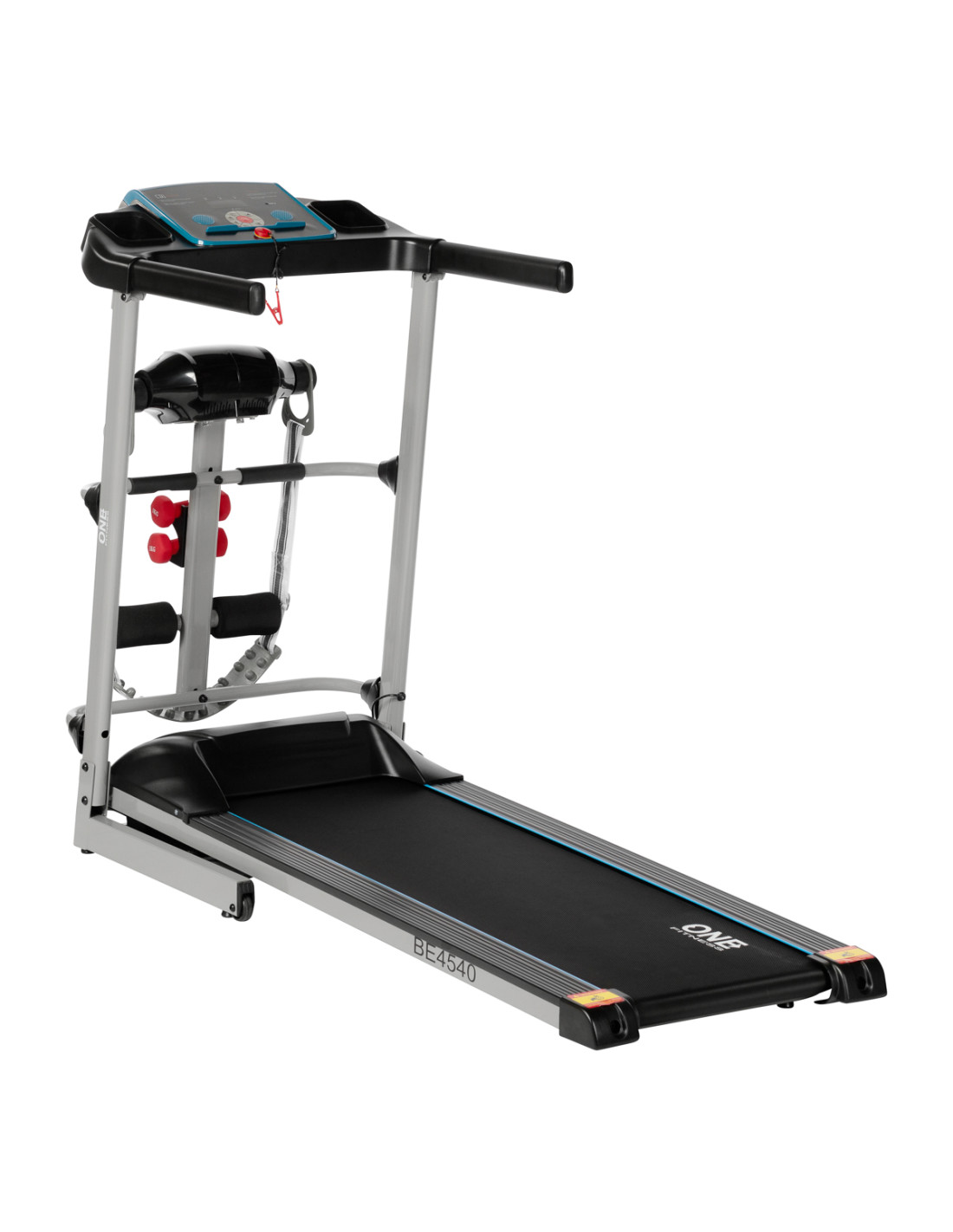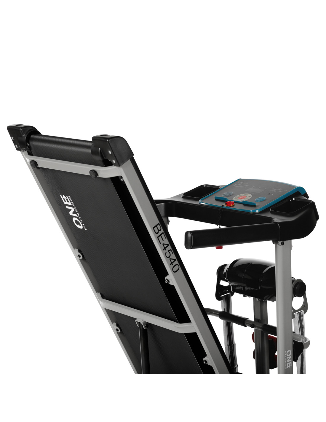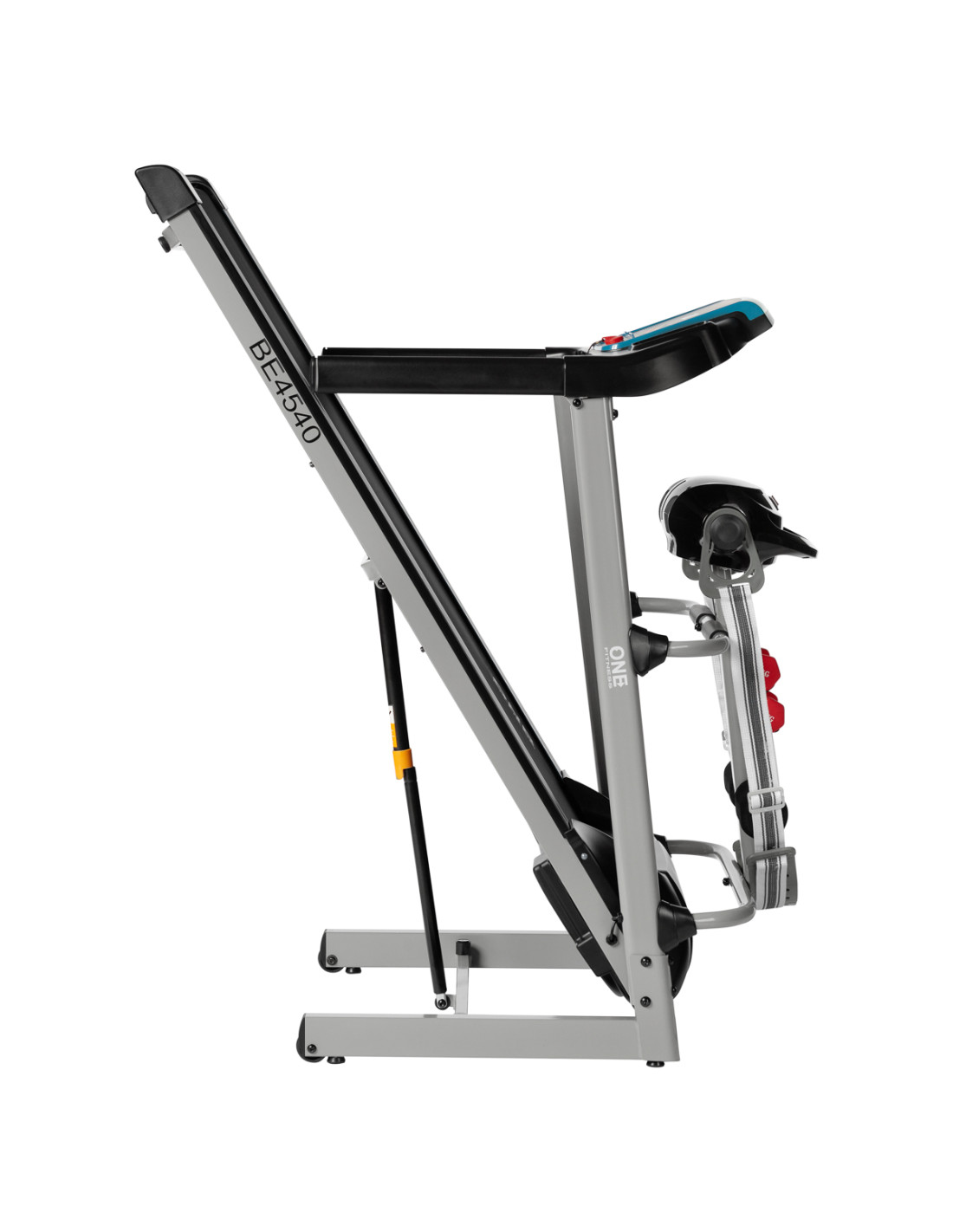 Комплектът бягаща пътека включва масажор, който намалява риска от възпалени мускули, като ги отпуска перфектно. Този масаж също има положителен ефект върху кръвоносната система и насърчава възстановяването. Специални дръжки в предната част на бягащата пътека ви позволяват да изпълнявате основни сгъвания, докато лежите. Включените в комплекта дъмбели и дъска за баланс ви позволяват да разнообразявате упражненията. Бягащата пътека BE4540 ONE FITNESS ви позволява да тренирате цялото си тяло.
