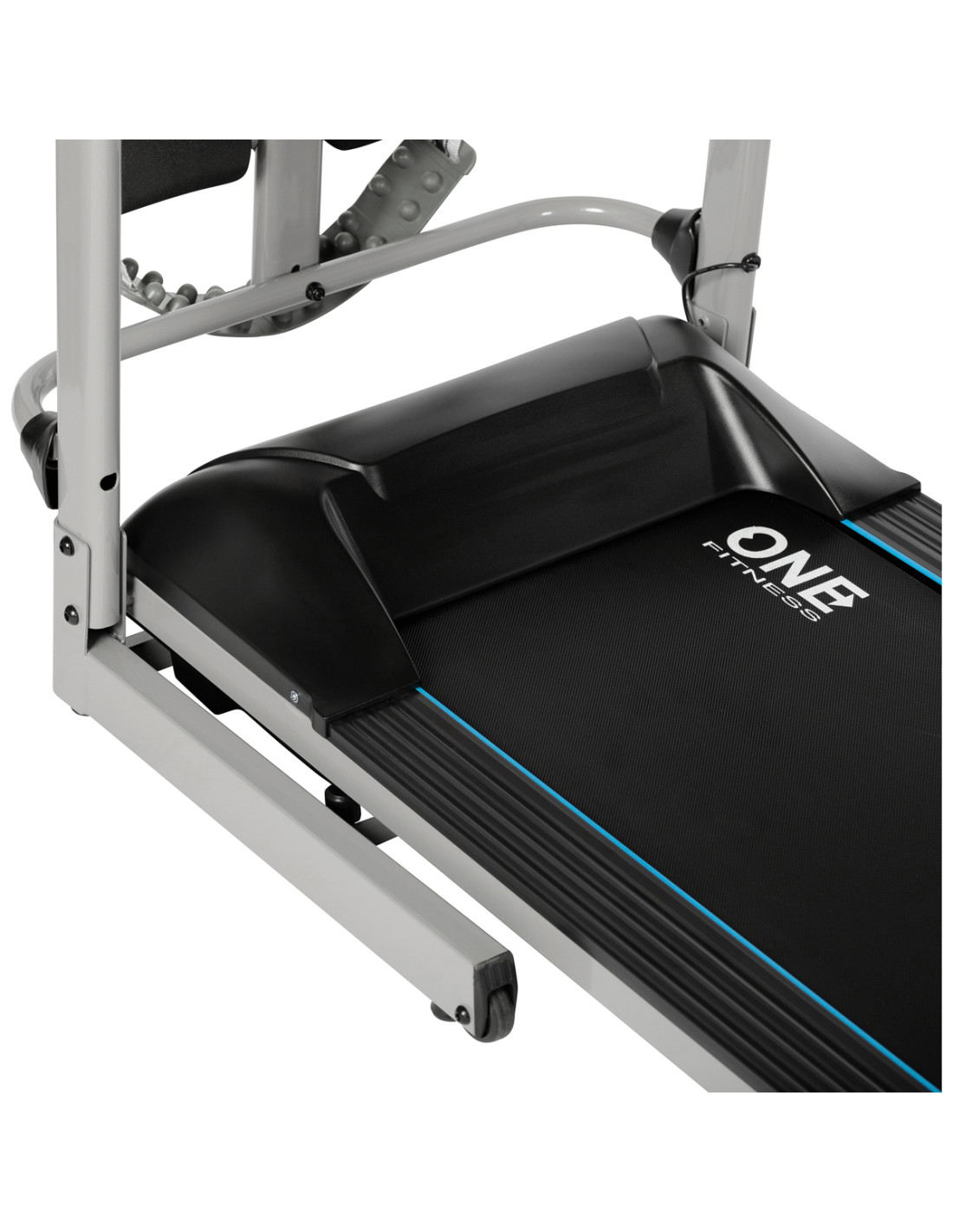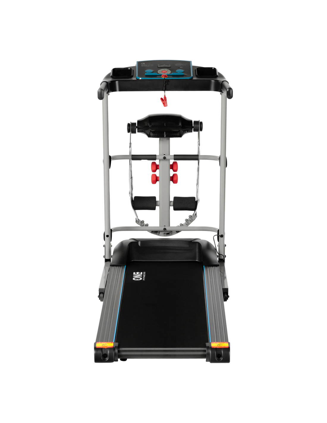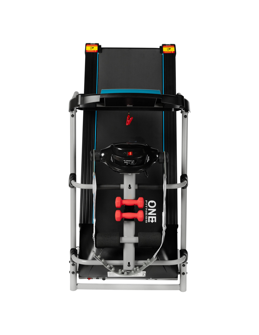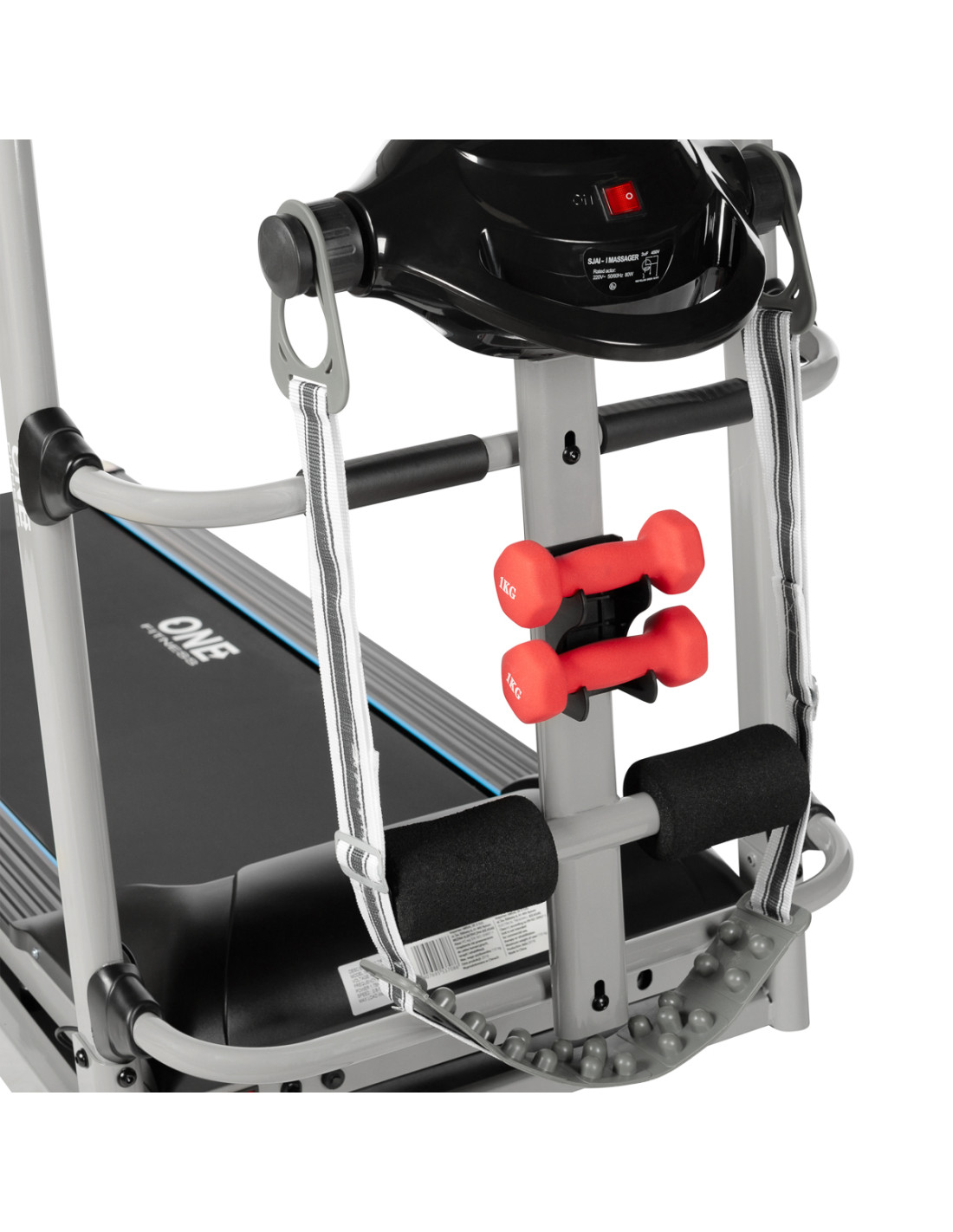 Комплектът бягаща пътека включва масажор, който намалява риска от възпалени мускули, като ги отпуска перфектно. Този масаж също има положителен ефект върху кръвоносната система и насърчава възстановяването. Специални дръжки в предната част на бягащата пътека ви позволяват да изпълнявате основни сгъвания, докато лежите. Включените в комплекта дъмбели и дъска за баланс ви позволяват да разнообразявате упражненията. Бягащата пътека BE4540 ONE FITNESS ви позволява да тренирате цялото си тяло.