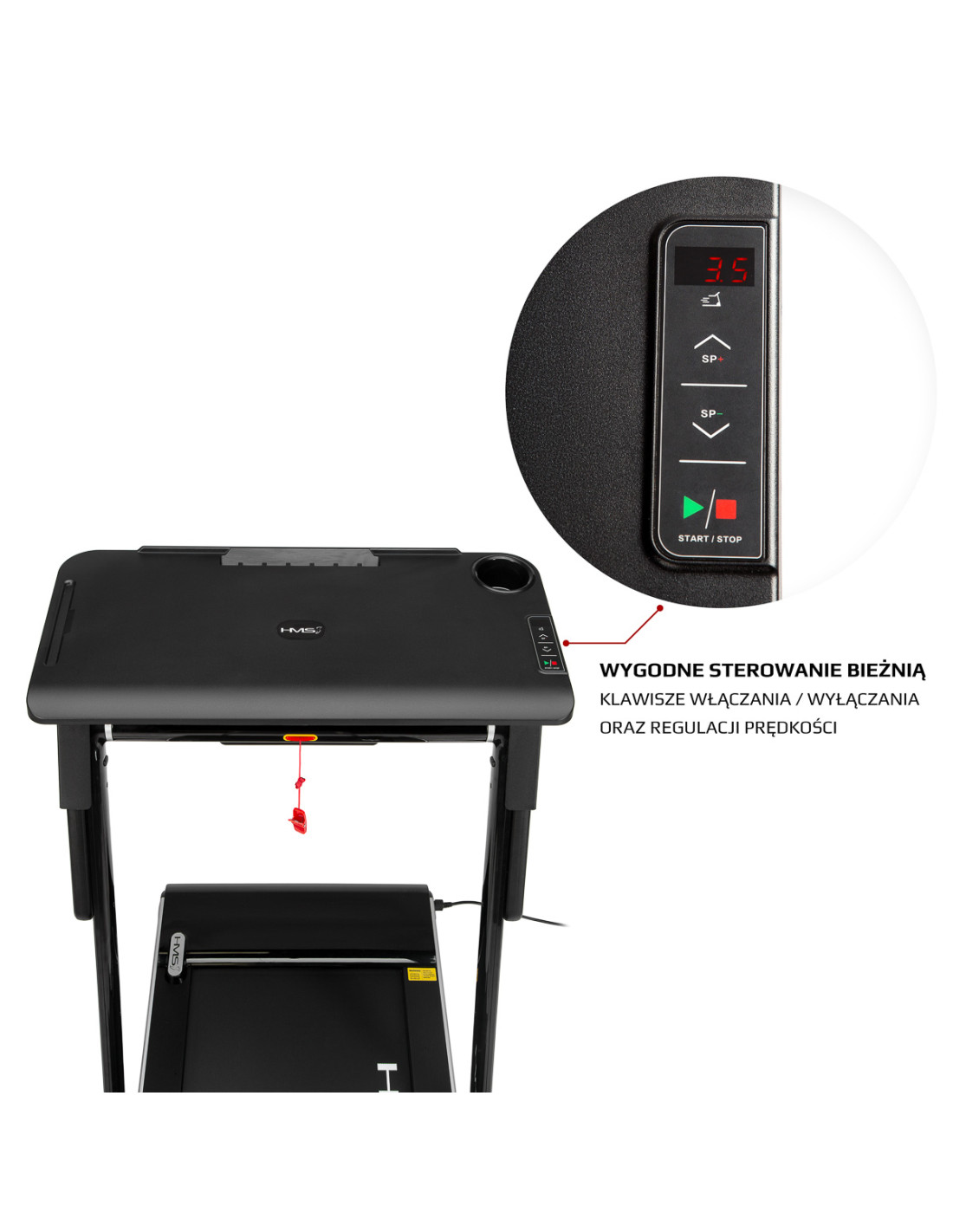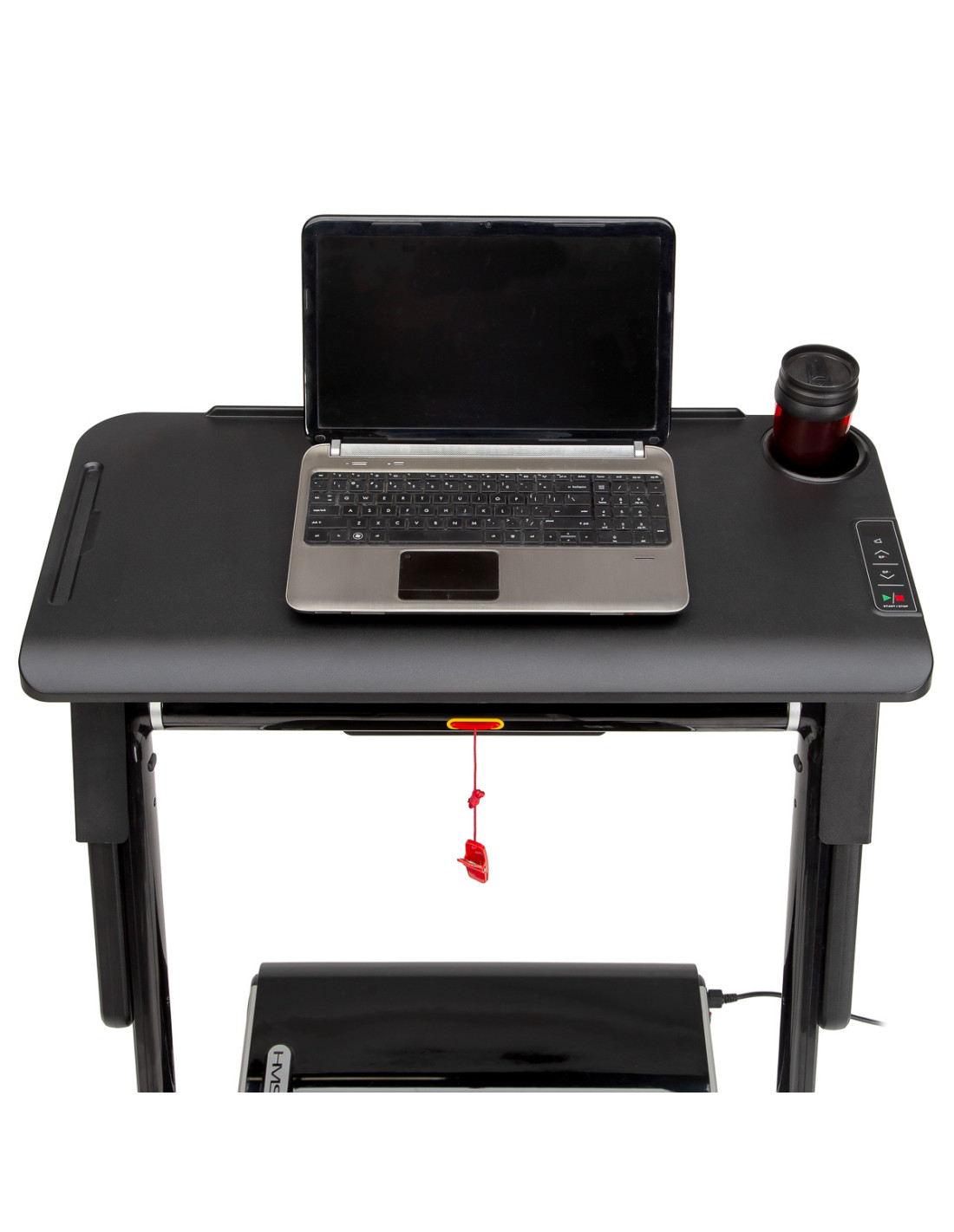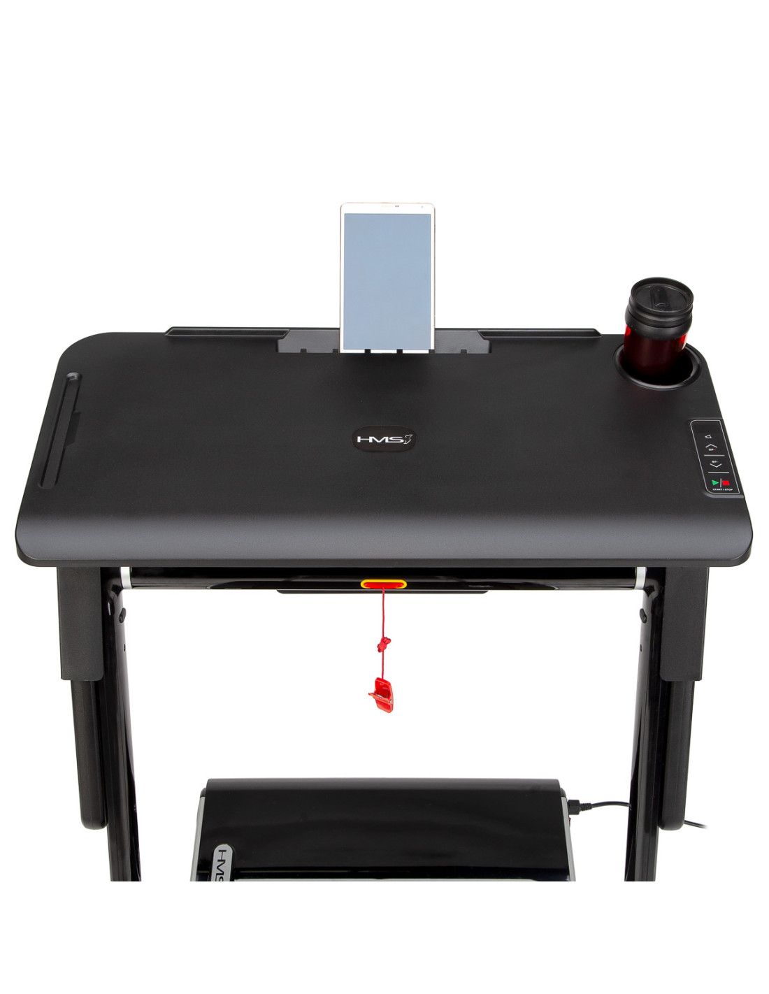 Mit diesem Laufband-Schreibtisch ist es möglich, die Arbeit mit der körperlichen Aktivität zu verbinden. Diese Lösung schränkt die Geschwindigkeit auf 6 km/h ein. Die Benutzung Ihres Laptops wird beim schnellen Gehen kein Problem. Auf dem Schreibtisch befindet sich eine Halterung für Ihre Trinkflasche oder Ihren Becher. Sie finden auch eine Halterung für Ihr Tablet. Mit dem speziellen Bedienfeld können Sie jeden Moment das Tempo verlangsamen oder das Laufband ausschalten.