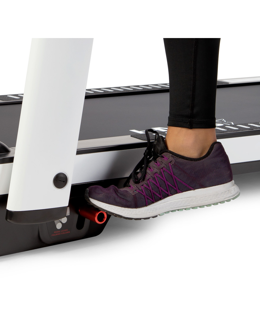 Ein weiterer Vorteil ist die Größe dieses Laufbands. Mit dem klappbaren Handlauf ist es platzsparend. Der Handlauf klappt sich spontan nach dem Lösen des Sicherungsmechanismus und dem leichten Drücken zusammen. Dieser Sicherungsmechanismus befindet sich unten des Laufbands, um ihn bequem mit dem Fußdrücken zu lösen. Die Verschiebung vom LOOP14 bereitet keine Schwierigkeiten, weil es die Transporträder hat.