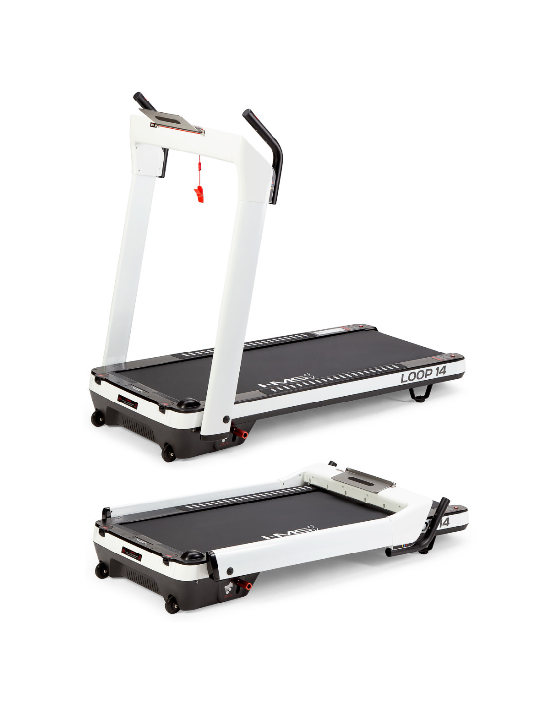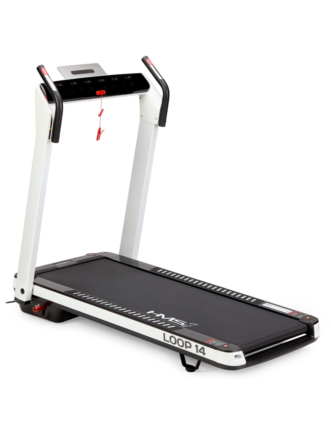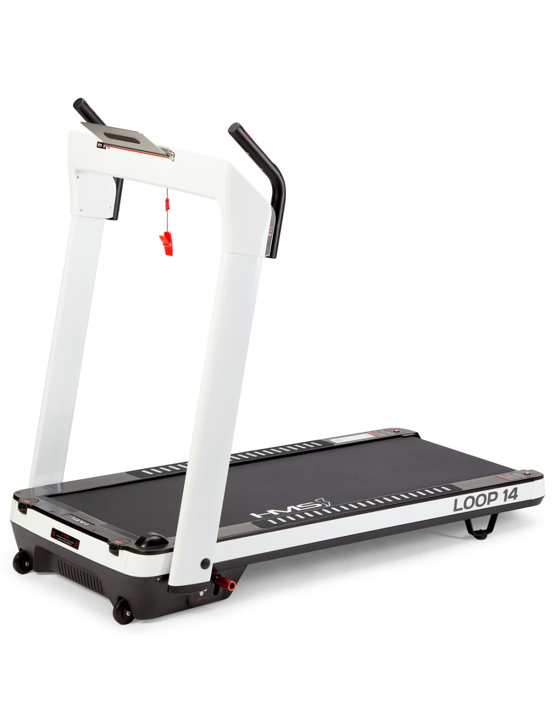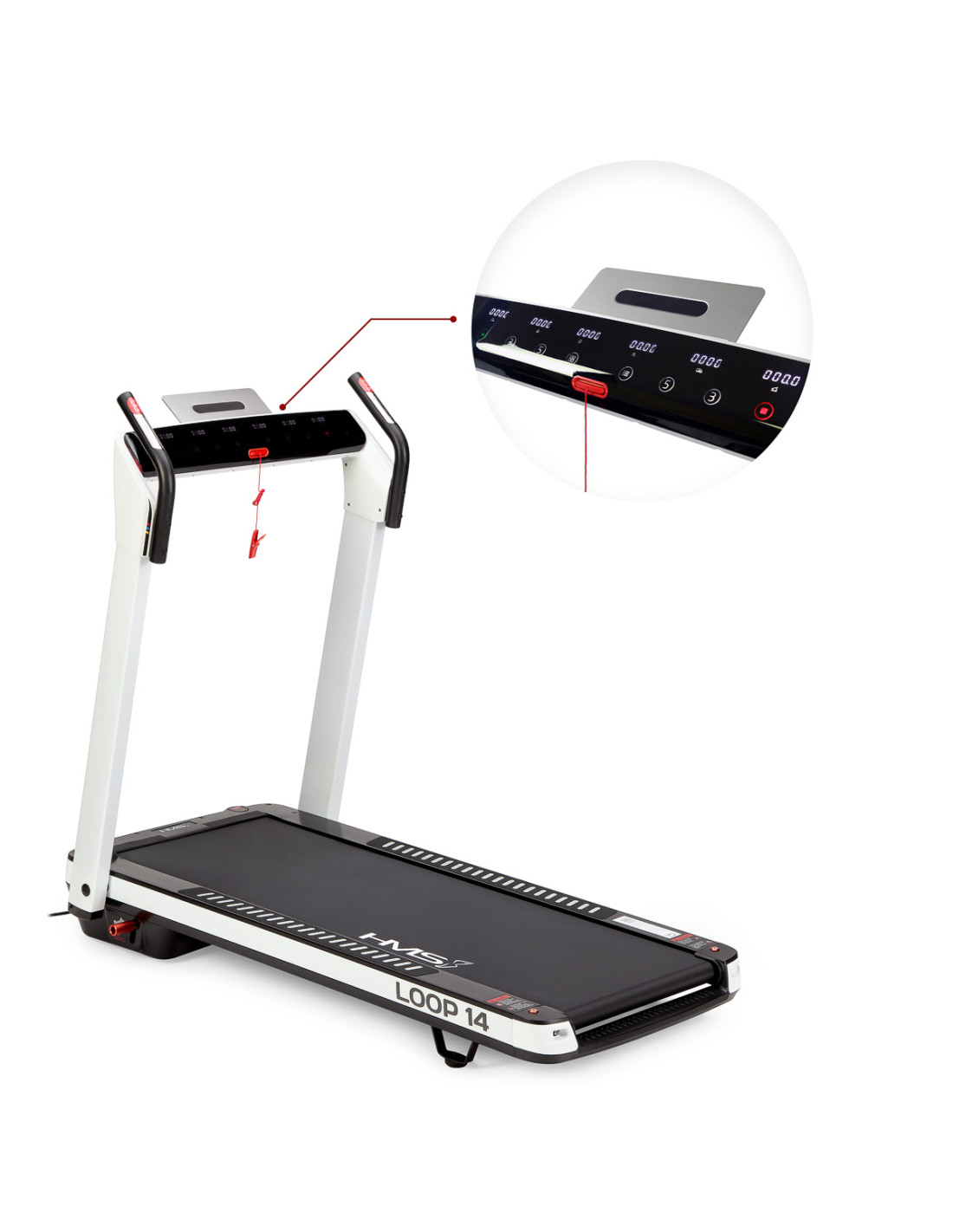 Das Laufband ist mit einer 12-stufigen Neigungsfunktion des Laufbandgurts ausgestattet. LOOP14 HMS verfügt über eine automatische Verstellung des Neigungswinkels des Laufbandgurts sowie eine Verstellung der Geschwindigkeit. Das Gerät ist zudem mit zusätzlichen Handpulssensoren zur Pulsmessung ausgestattet.