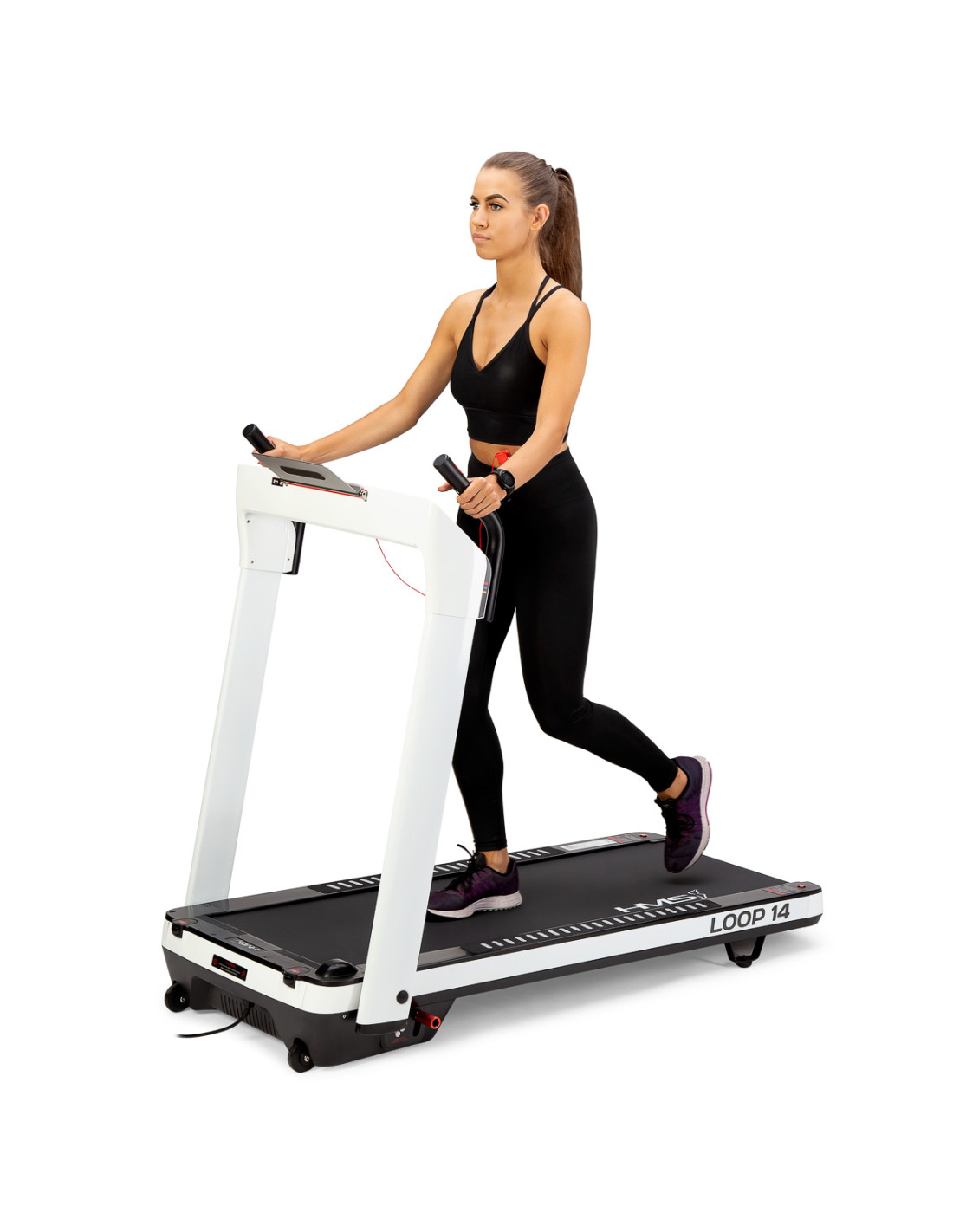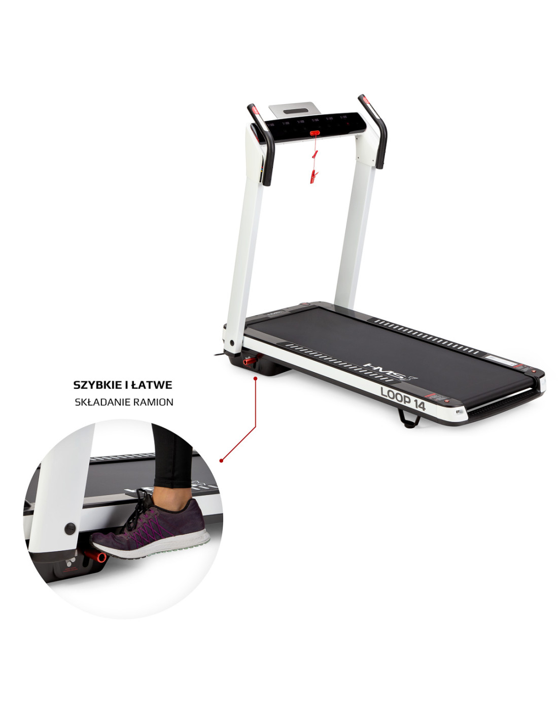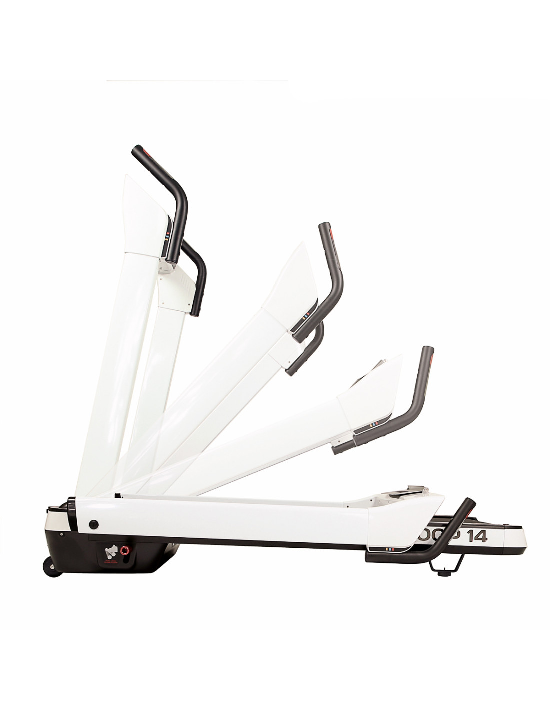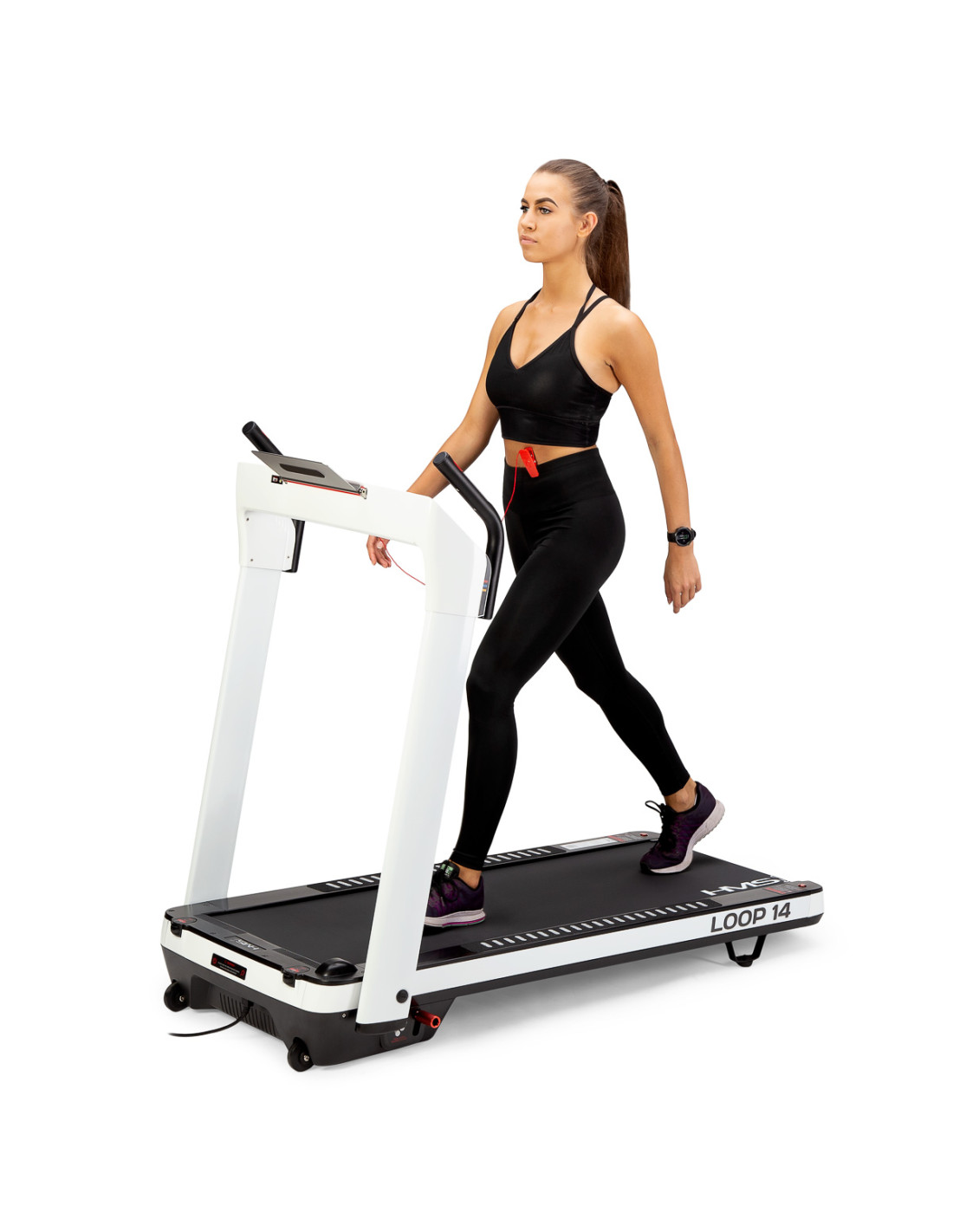 Das Laufband ist mit einer 12-stufigen Neigungsfunktion des Laufbandgurts ausgestattet. LOOP14 HMS verfügt über eine automatische Verstellung des Neigungswinkels des Laufbandgurts sowie eine Verstellung der Geschwindigkeit. Das Gerät ist zudem mit zusätzlichen Handpulssensoren zur Pulsmessung ausgestattet.
