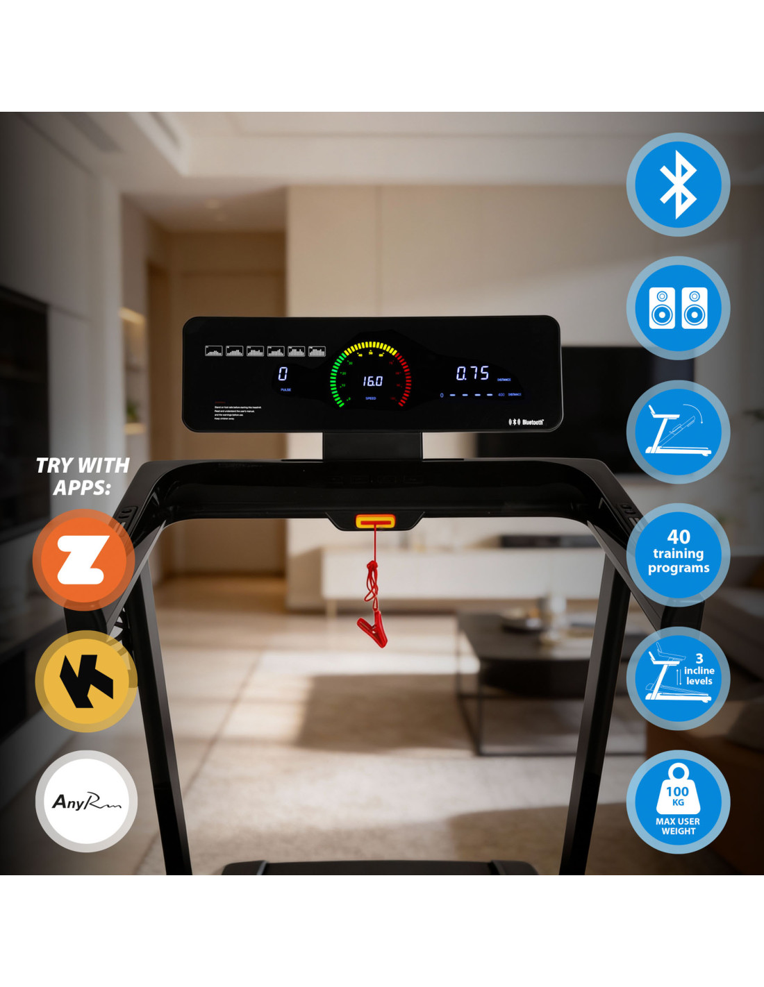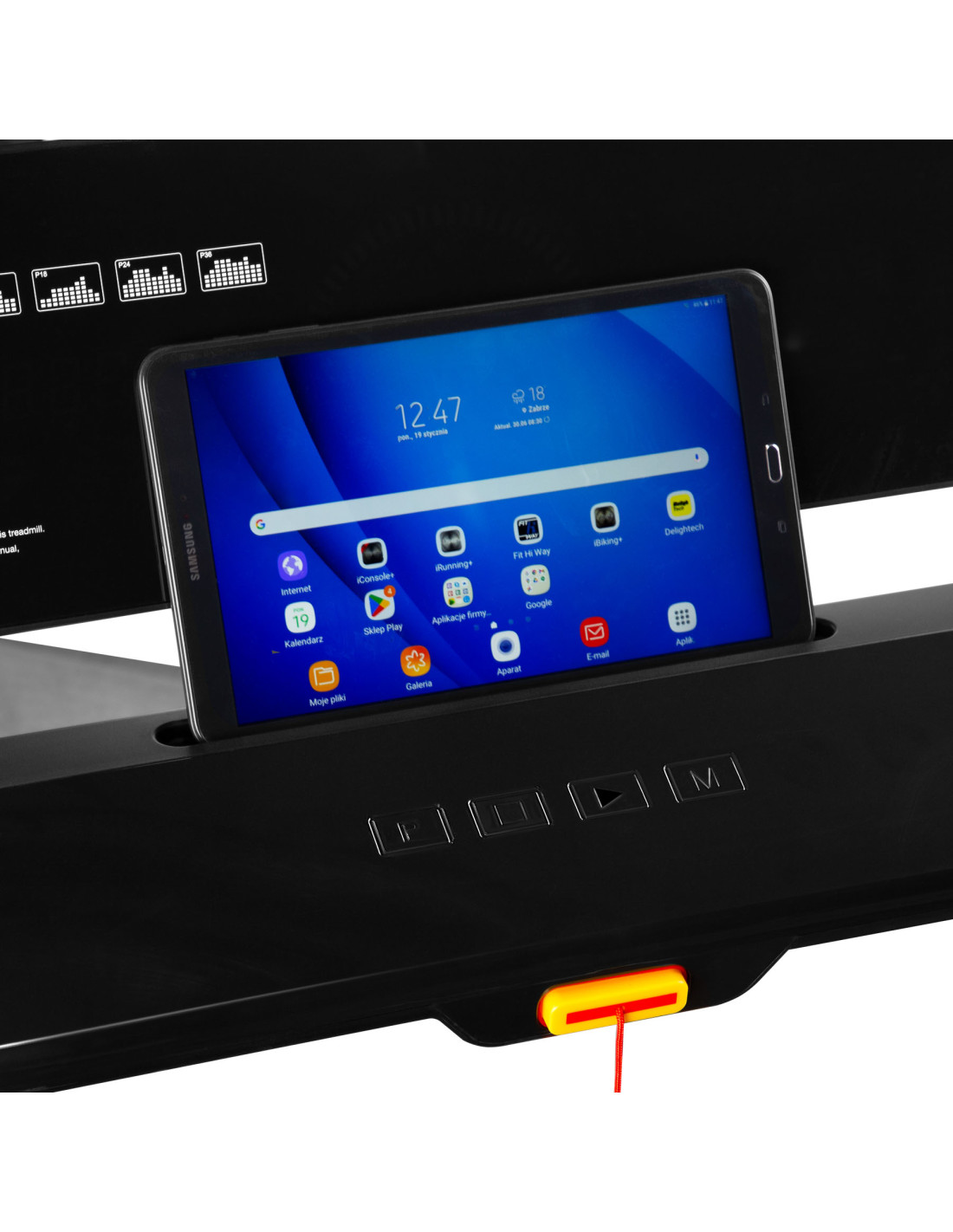 Вграденият Bluetooth модул и двата високоговорителя ви позволяват да възпроизвеждате музика и звуци от приложения за тренировки, докато държачът за таблет осигурява удобно използване на мобилни устройства по време на бягане или ходене.