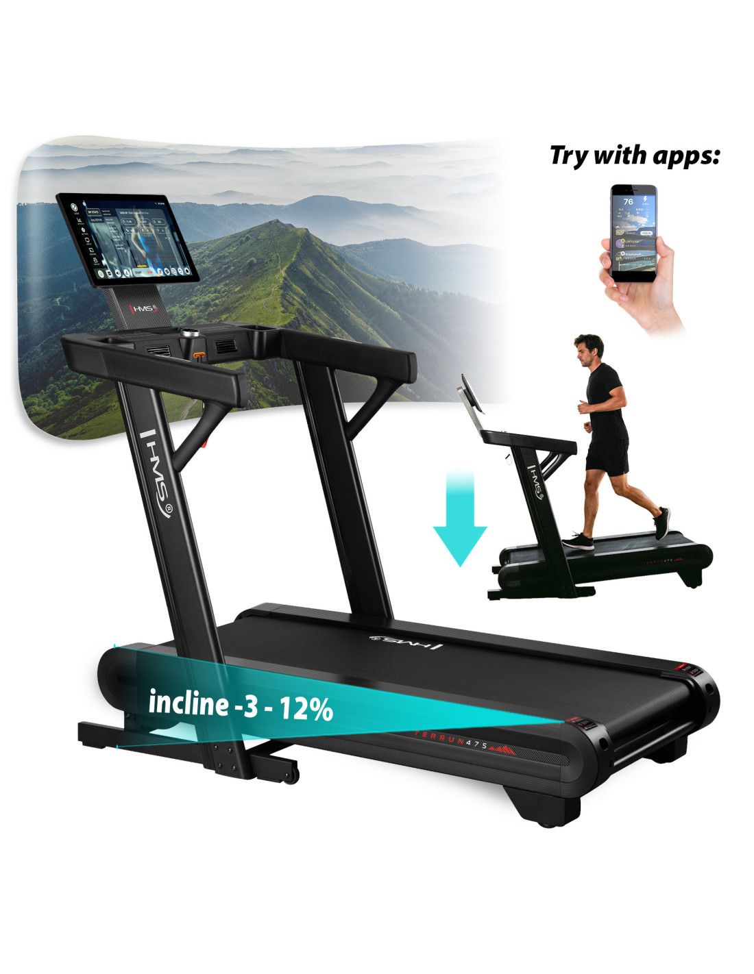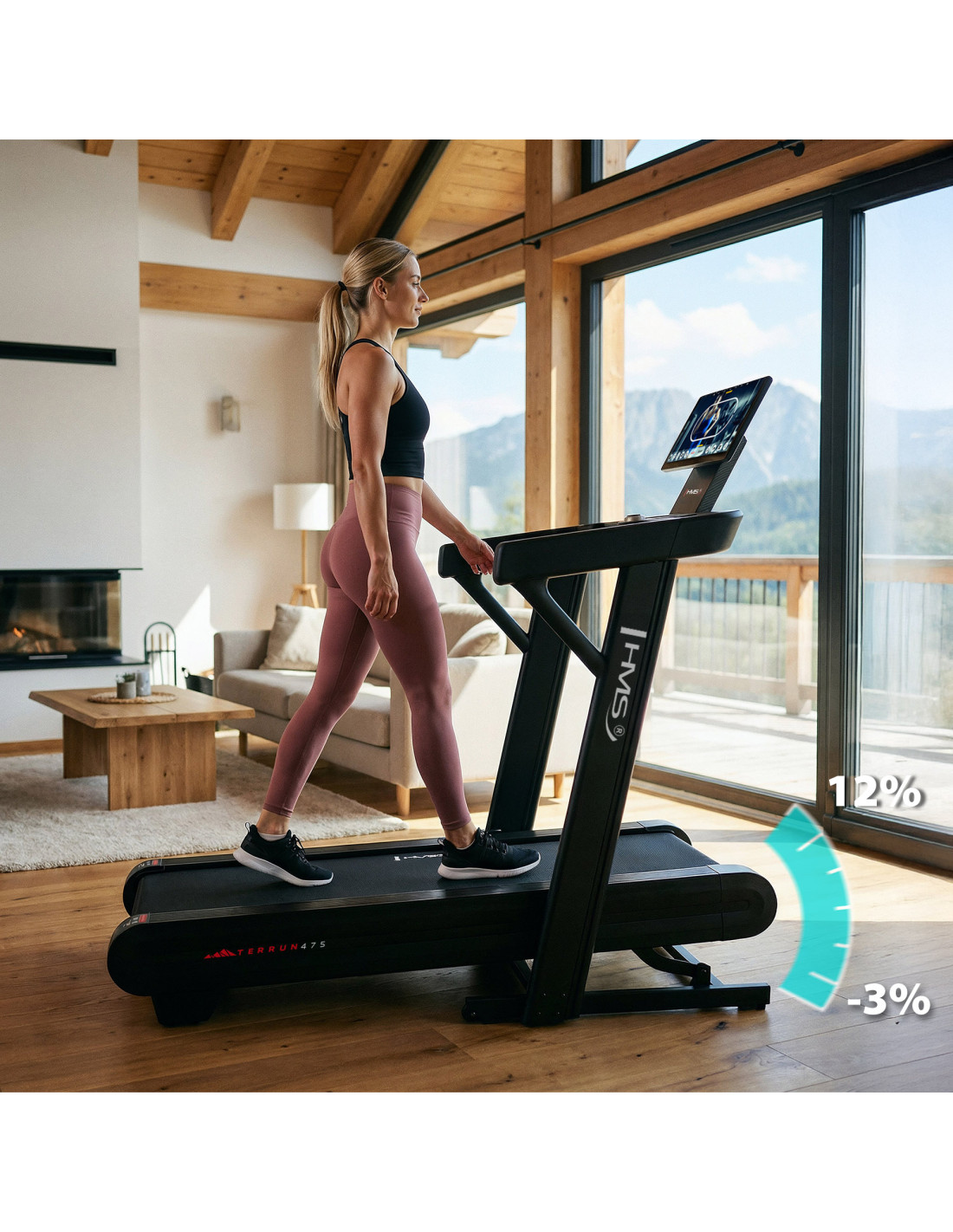 Бягащата пътека TERRUN475 разполага с двойно регулиране на наклона от -3% до 12% , реалистично симулирайки бягане по разнообразен терен . Възможността за симулиране както на спускания, така и на стръмни изкачвания , кара тренировката да се усеща като бягане по планински пътеки или хълмисти маршрути. Този широк диапазон на наклона интензивно ангажира краката, седалищните мускули и торса.