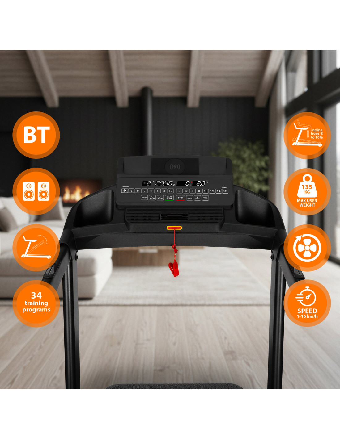 Това ви позволява да тренирате с любимата си музика или видеоклипове, без да се притеснявате за нивото на батерията на вашия смартфон. Освен това, бягащата пътека е съвместима с избрани спортни часовници.