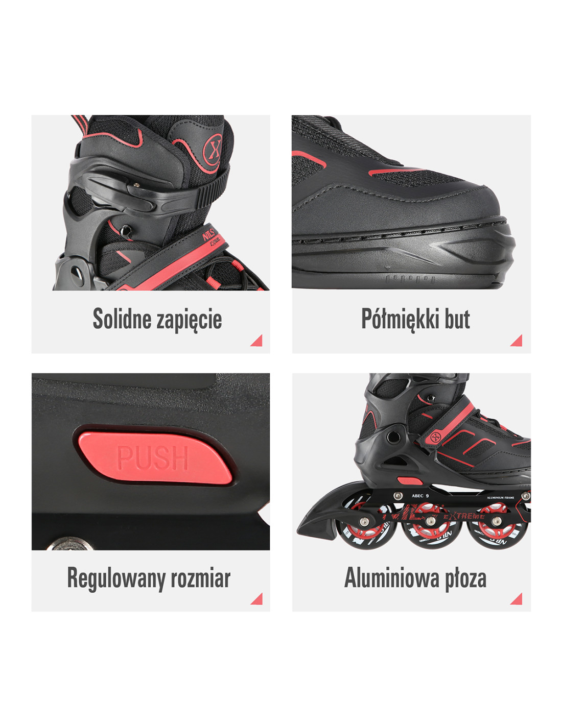 Меките колела осигуряват добро сцепление и абсорбират всички вибрации. Системата за затваряне, състояща се от катарама от две части, велкро и връзки, осигурява максимална безопасност по време на каране. Спирачката е изработена от най-високо качество PP. Този материал е устойчив на удар и позволява безопасно спиране дори при относително високи скорости.