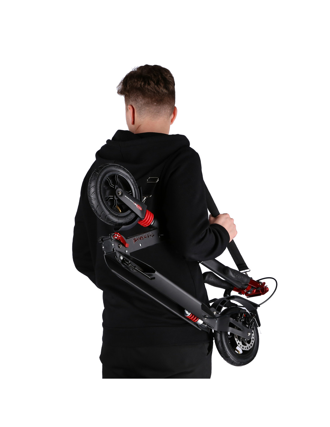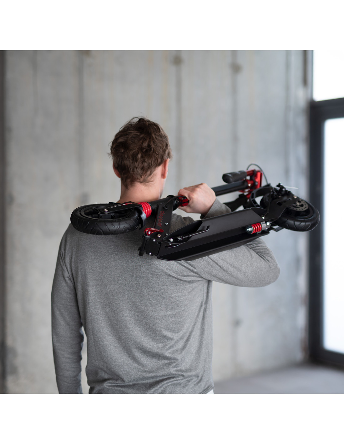 Със скутера HM209T комфортът при пътуване е само на едно докосване. Издръжливите лагери ABEC9 гарантират гладко возене и изключителна издръжливост, докато пълните с въздух колела с диаметър 200 mm правят всяко пътуване гладко и приятно. Скутерът също така разполага с предни и задни амортисьори, уникална характеристика в тази продуктова категория и подчертаваща неговия изключителен комфорт при возене независимо от неравен терен. Регулируемото кормило позволява тротинетката да се регулира според размера на потребителя и осигурява идеална ергономичност.