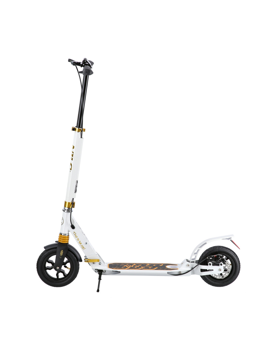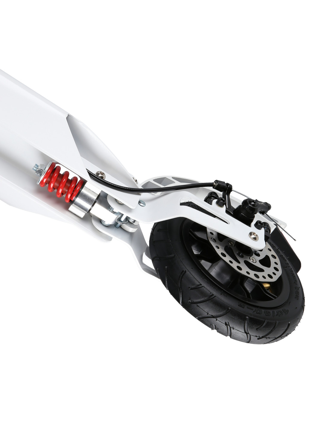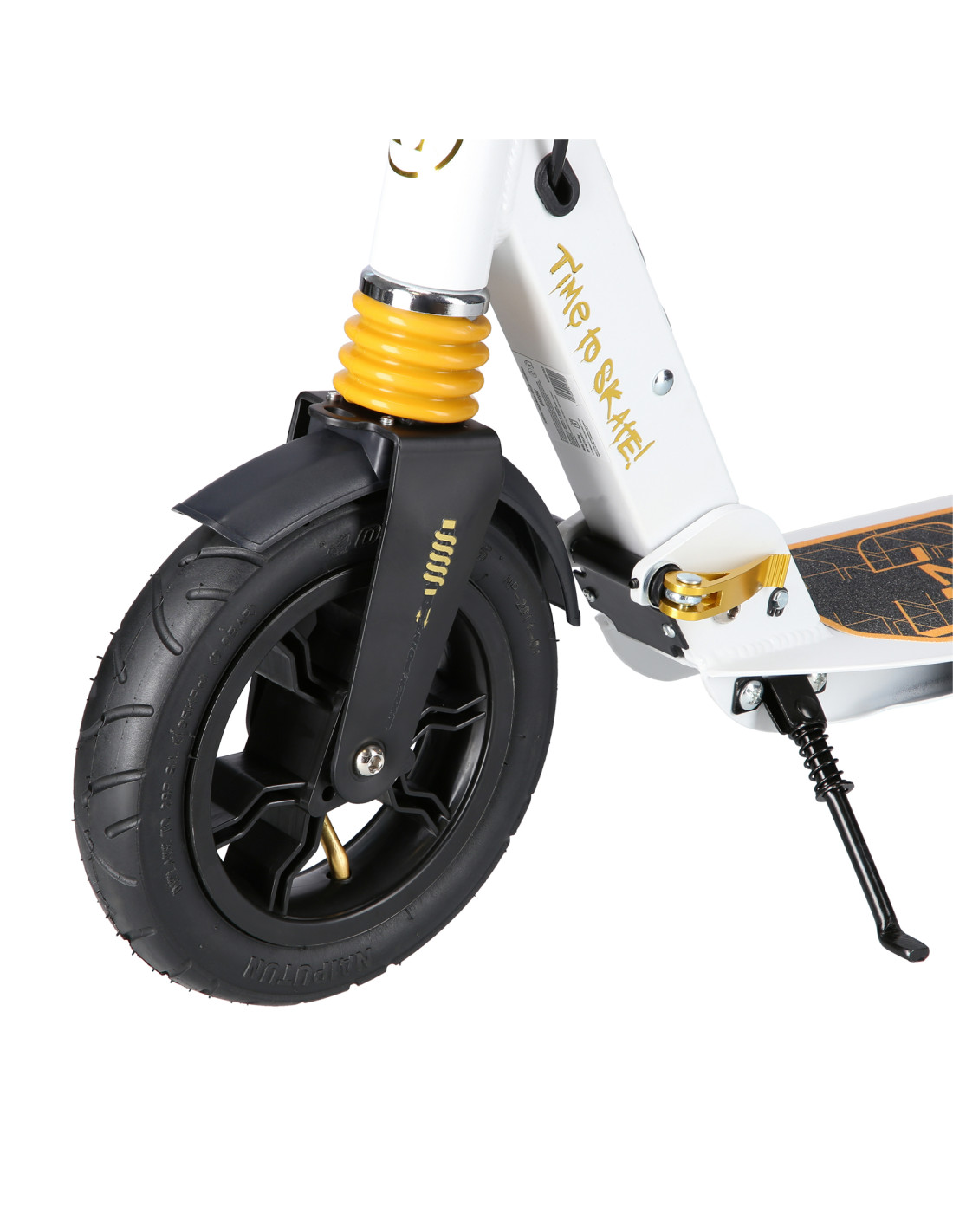 Със скутера HM209T комфортът при пътуване е само на едно докосване. Издръжливите лагери ABEC9 гарантират гладко возене и изключителна издръжливост, докато пълните с въздух колела с диаметър 200 mm правят всяко пътуване гладко и приятно. Скутерът също така разполага с предни и задни амортисьори, уникална характеристика в тази продуктова категория и подчертаваща неговия изключителен комфорт при возене независимо от неравен терен. Регулируемото кормило позволява тротинетката да се регулира според размера на потребителя и осигурява идеална ергономичност.
