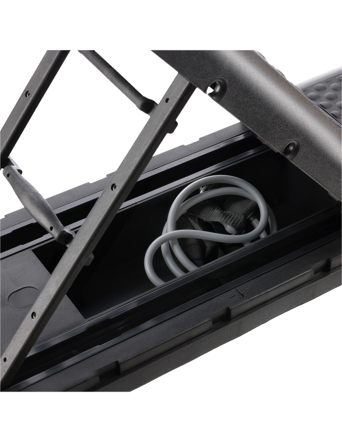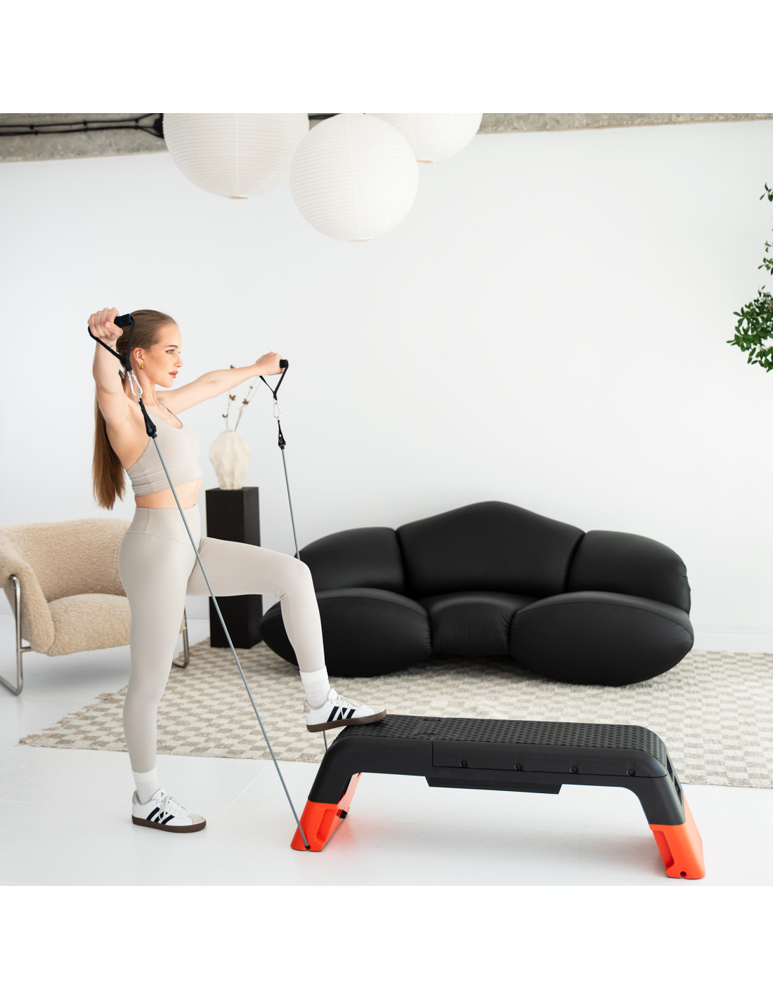 Степ платформата разполага с интегрирано място за съхранение на малки аксесоари като ленти, съпротивителни ленти или въжета за скачане, така че винаги да имате всичко необходимо за вашата тренировка на една ръка разстояние. Комплектът включва и експандери, които ви позволяват да изпълнявате силови тренировки без допълнителни тежести.