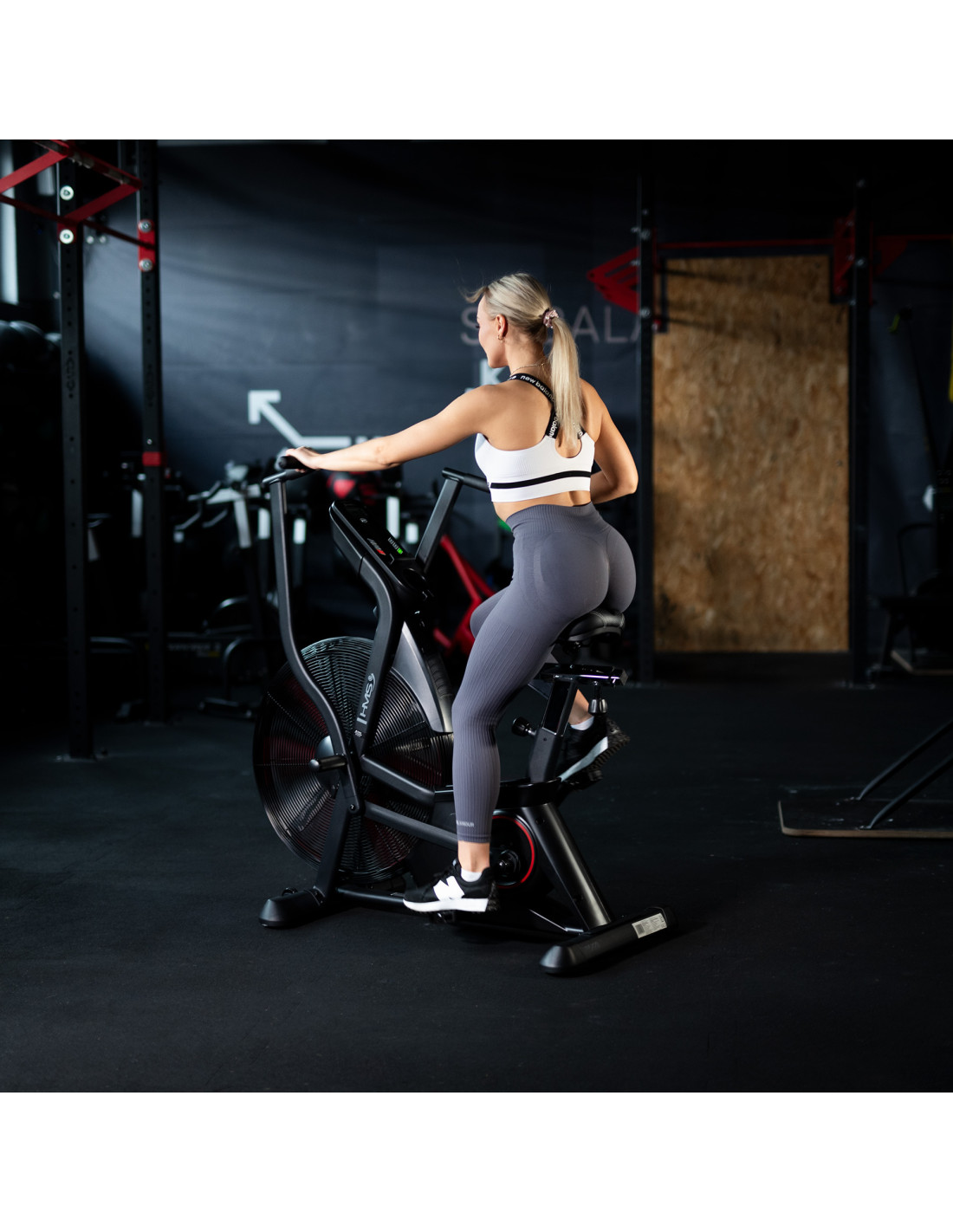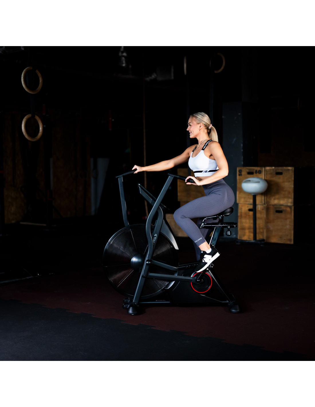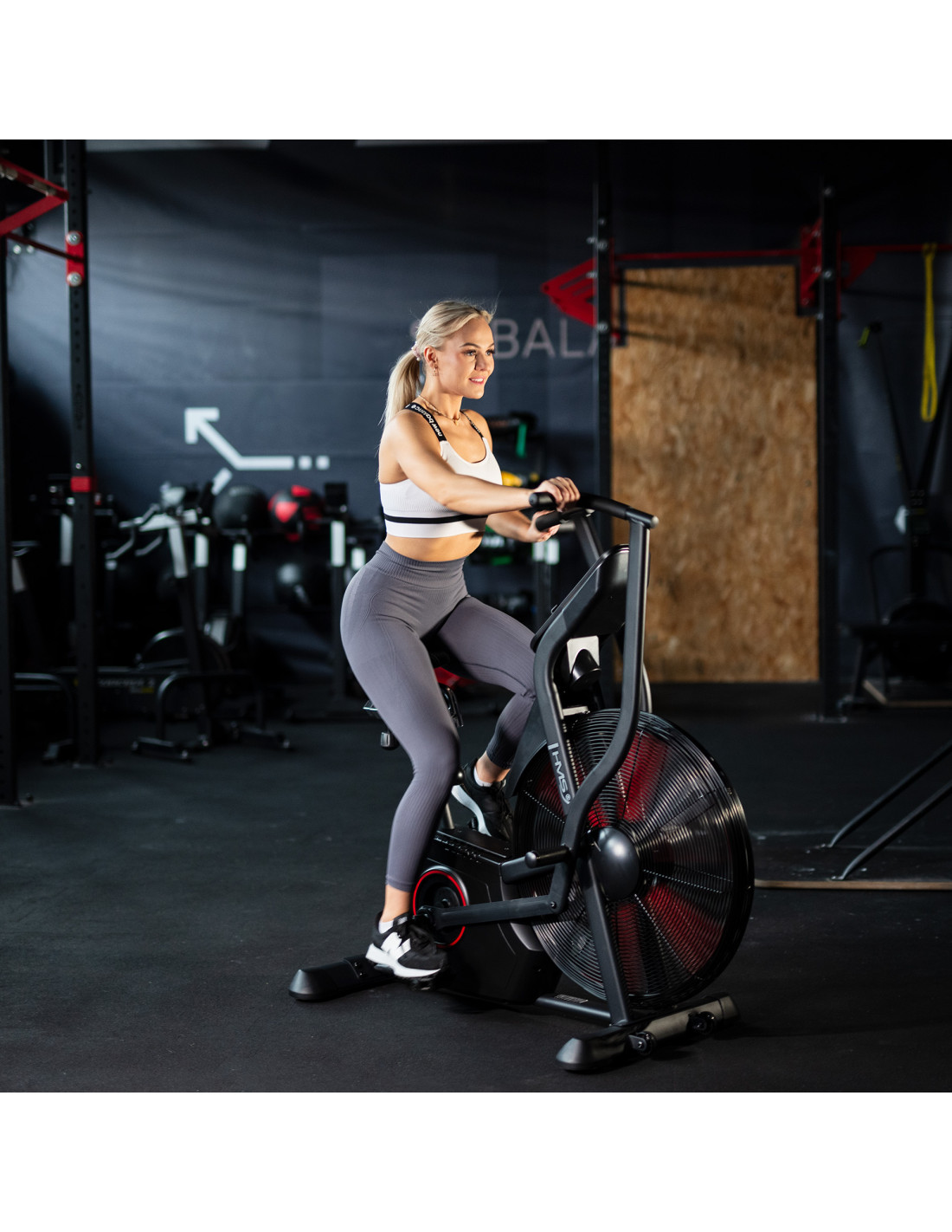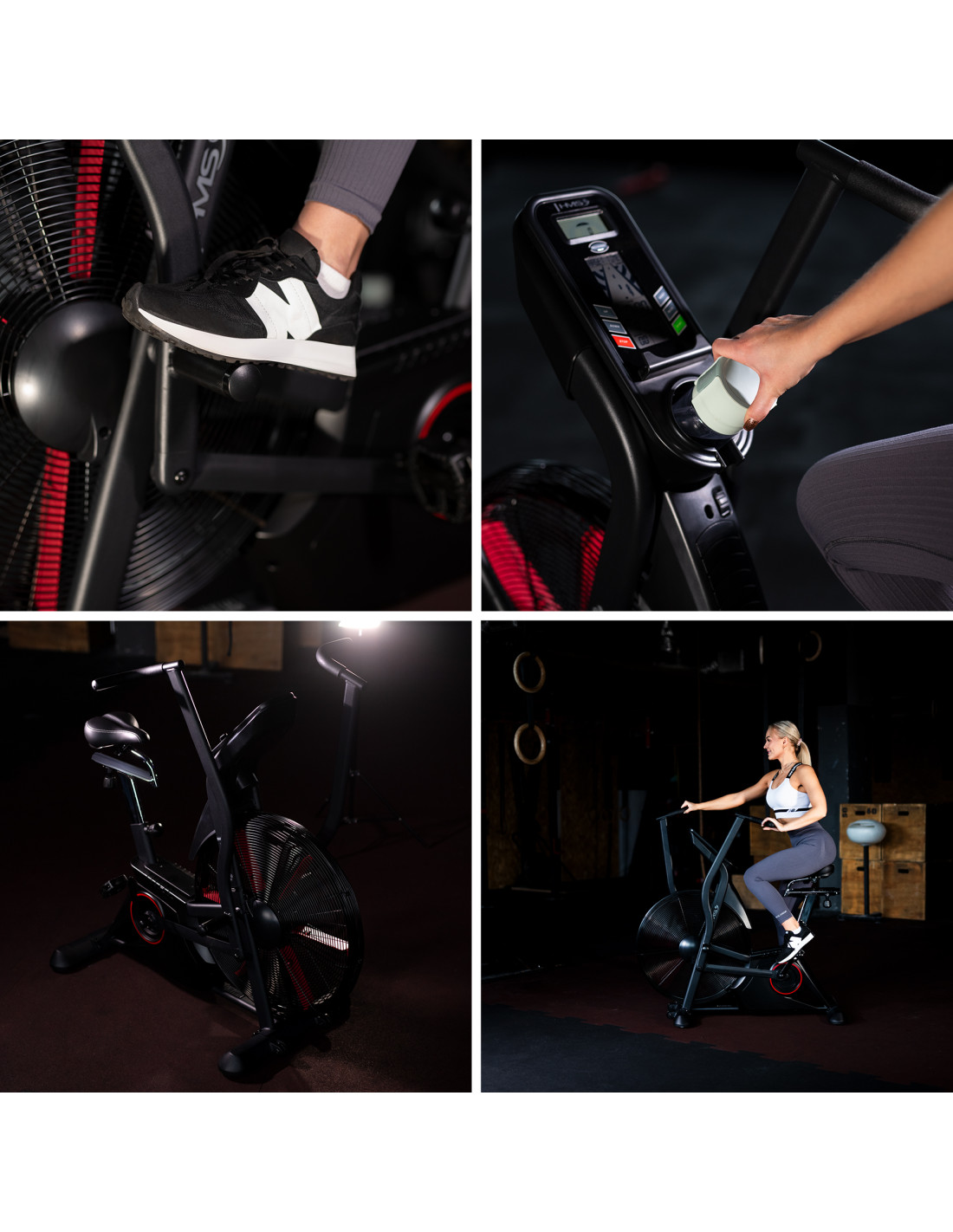 Das Airbike ist mit einem LCD-Display ausgestattet, mit dem Sie die wichtigsten Trainingsparameter kontinuierlich überwachen können: Zeit, Distanz, Geschwindigkeit, Puls, Kalorienverbrauch oder Umdrehungen pro Minute. Der vertikal und horizontal verstellbare Sattel ermöglicht eine präzise Anpassung der Position an Ihre Körpergröße und -form und sorgt für Komfort auch bei längerem Gebrauch. Praktische Extras wie ein Flaschenhalter, ein Handyhalter und Transporträder erhöhen den Bedienkomfort.
